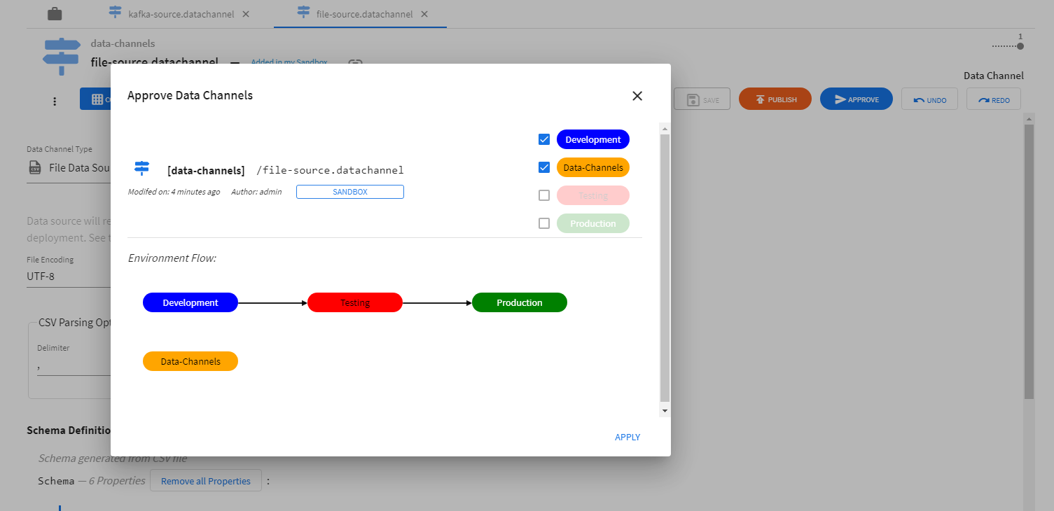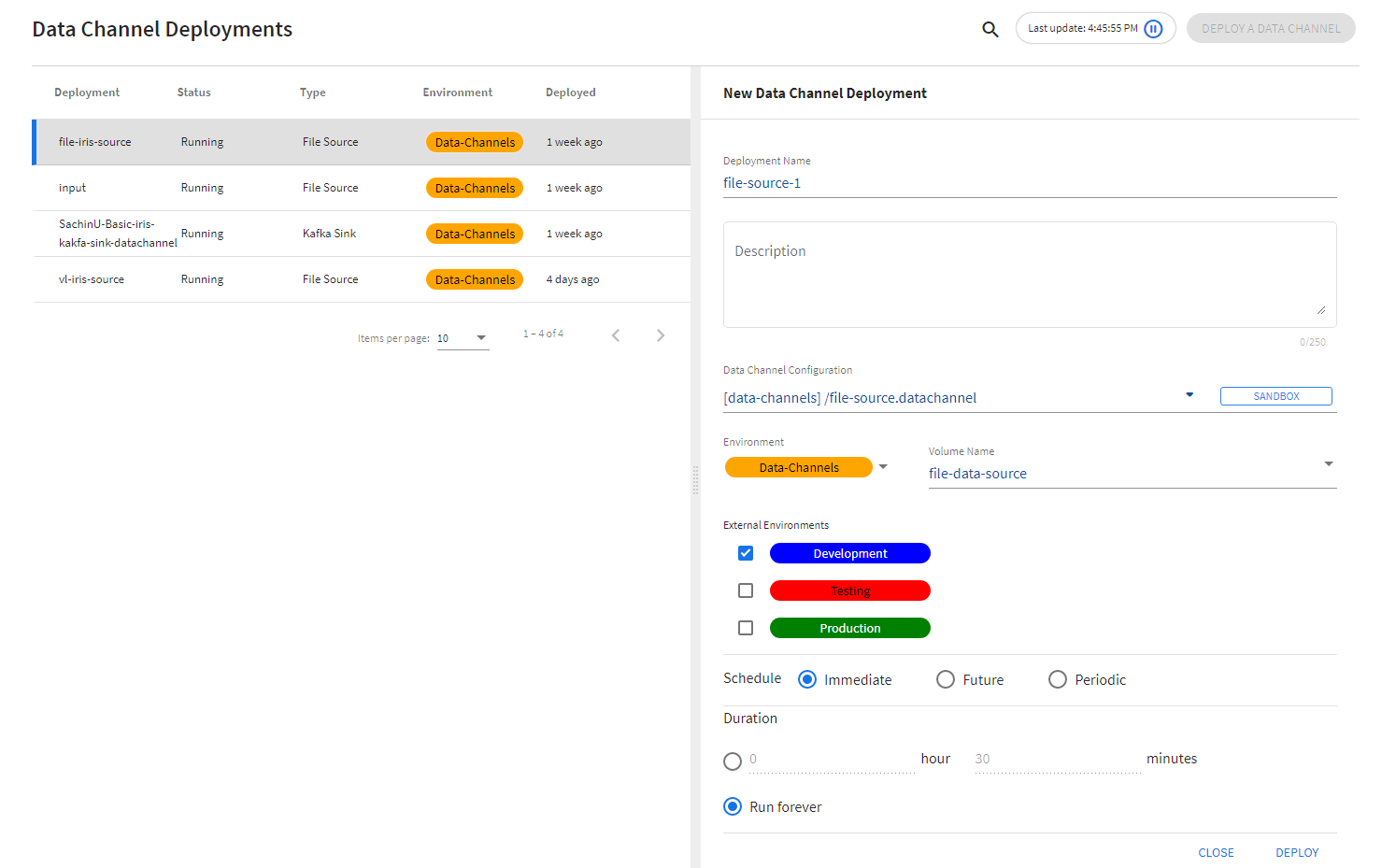 After creation and approval, data channel configurations can be deployed using the Deployments page. The Deployments page allows the user to: * provide a name for the deployment * select the configuration to be deployed * select environments for deployment * the schedule and duration for the deployment * data channel specific information (like Volume Name for File channels)