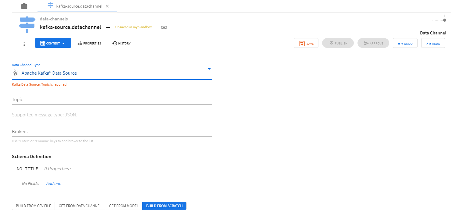 Kafka channels connect to running instances of Apache Kafka® brokers and a specific topic to read or write messages. The broker and topic information must be provided on the channel configuration page where the data channel schema is also specified.