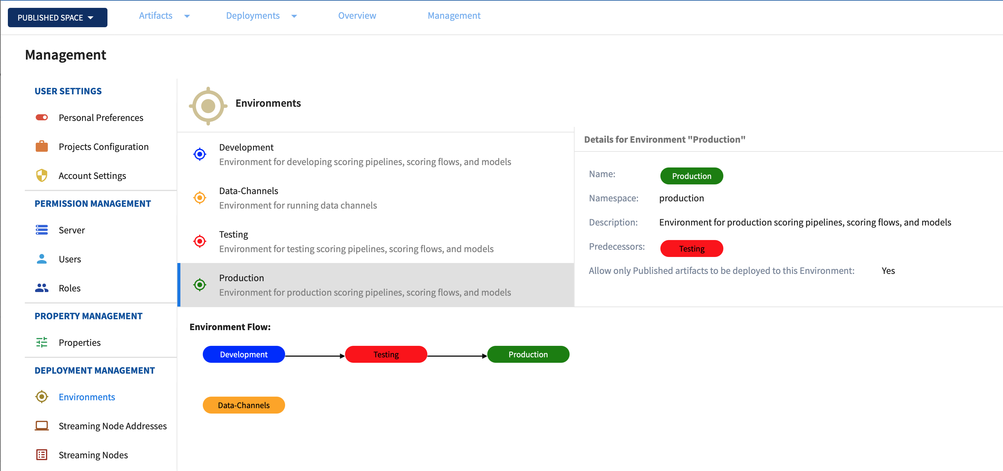 Pipelines and data channels are deployed to Kubernetes in namespaces. Namespaces are exposed as environments.