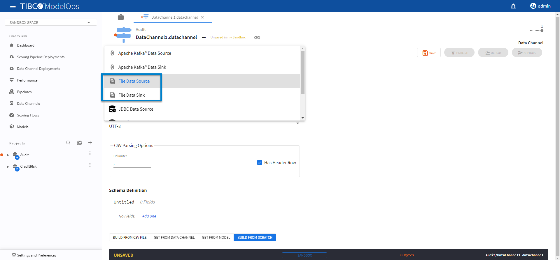 A data channel is a configurable and deployable component that maps between an external protocol and scoring flows. A data sink is a data channel that consumes output data with a known schema and a standard serialization format. It defines the format of the end result. On the other hand, a data source is a data channel that provides input data with a known schema and a standard serialization format.