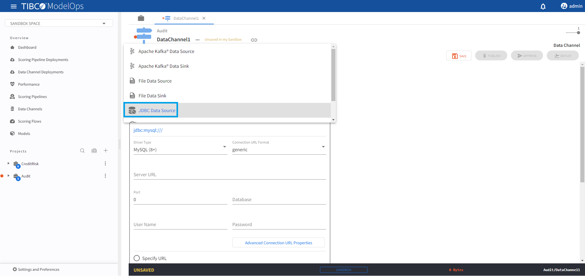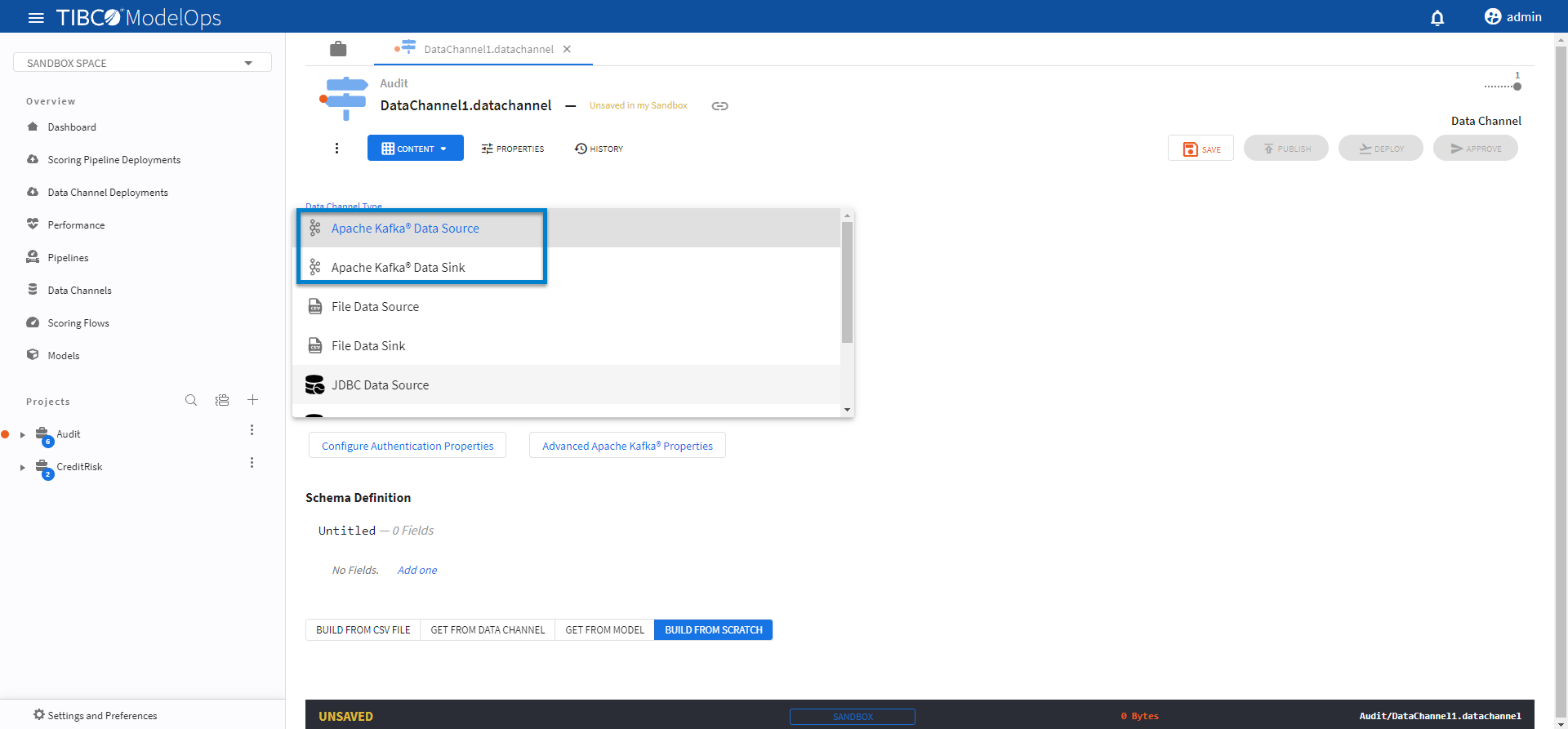 - On the Data Channel Type tab, select Apache Kafka® Data Source/Sink from the down-list.