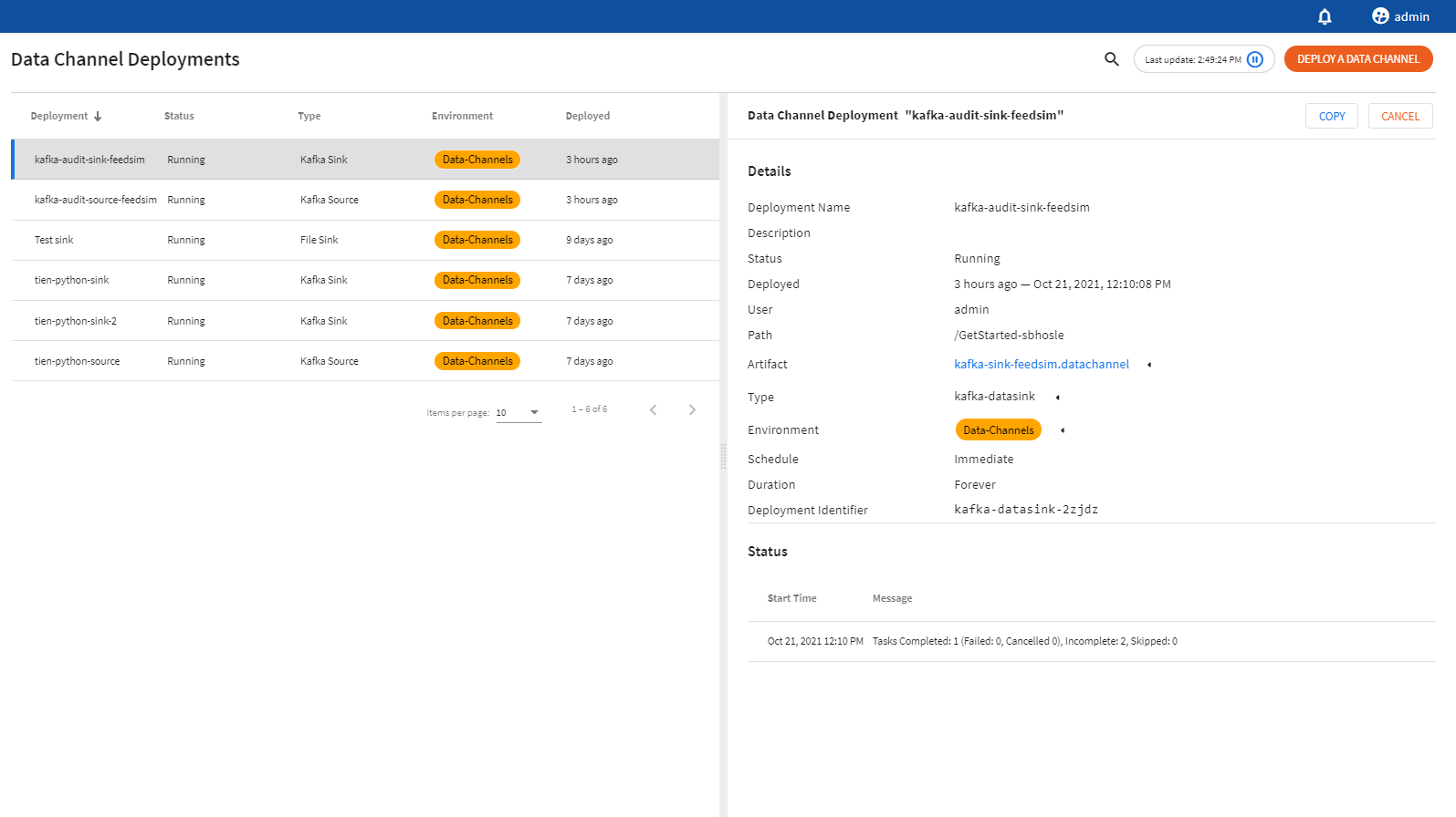 - The list shows information such as Deployment name, status of the deployed data channel, type of data channel, environment, and time of deployment.