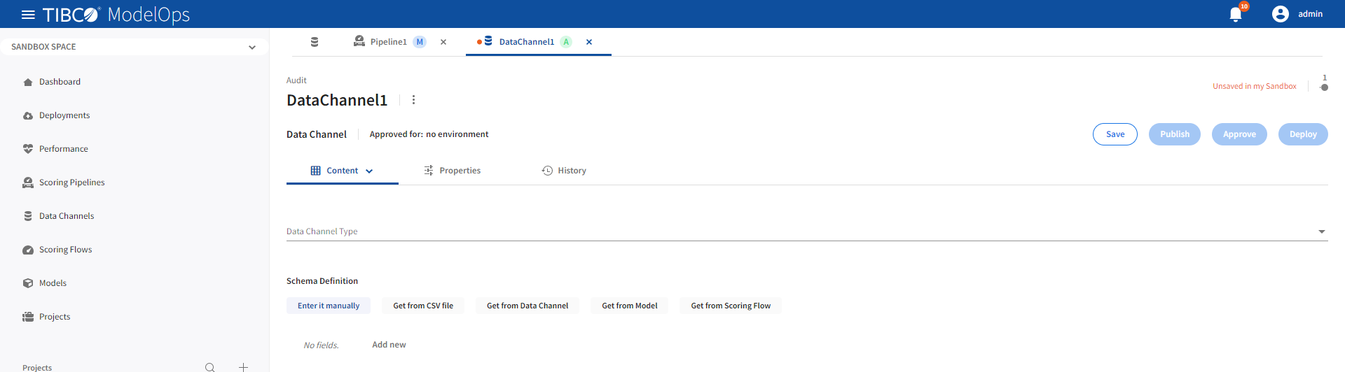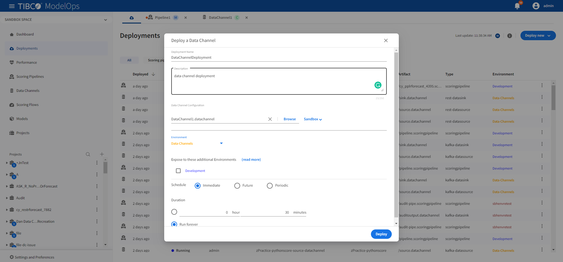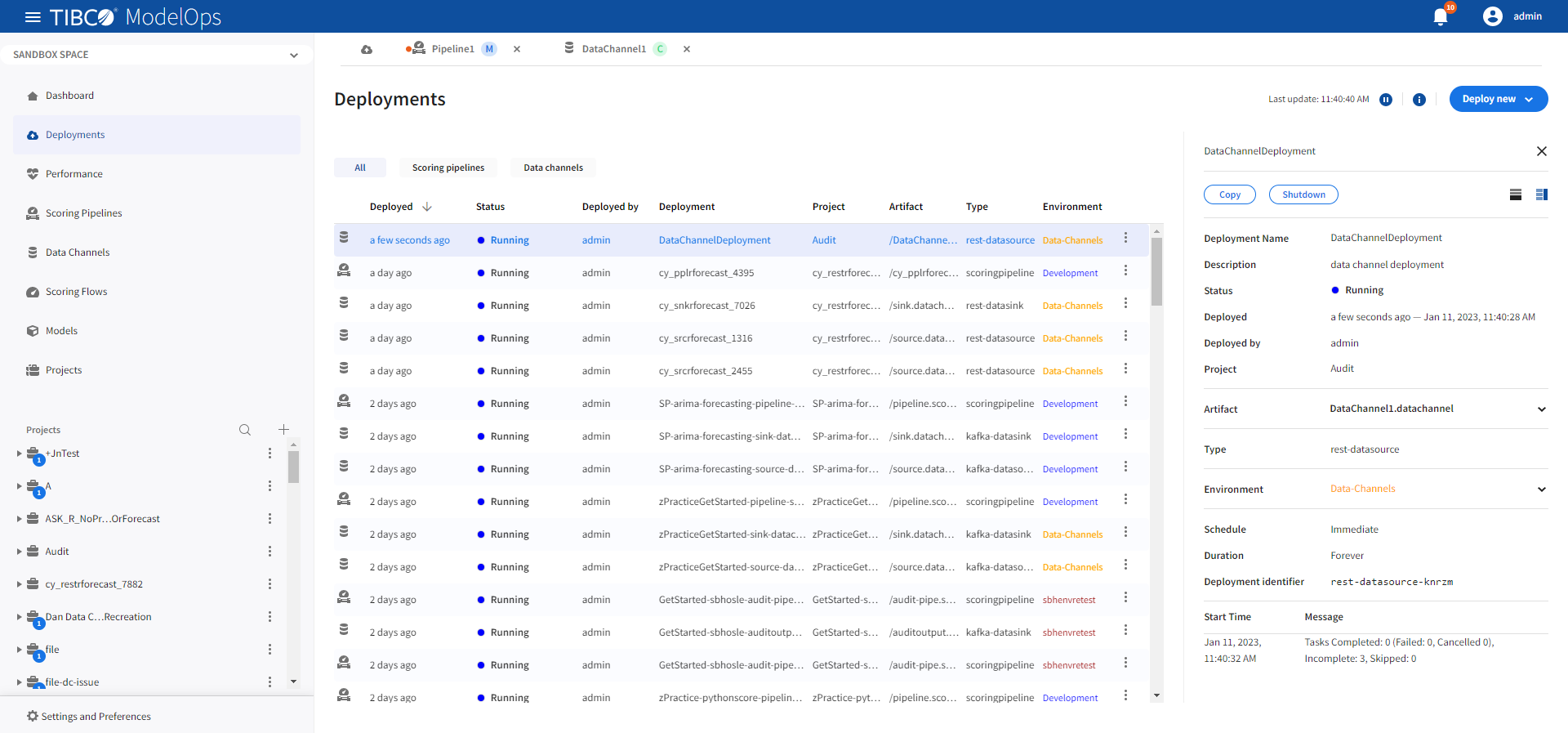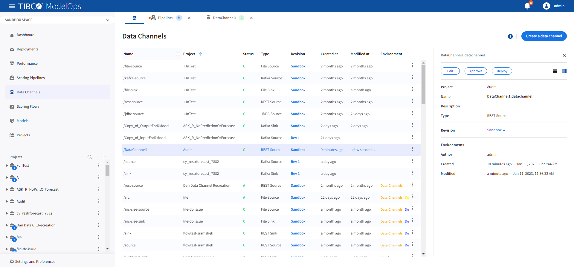- A list of deployed scoring pipelines and data channels appears here. Select Data channels filter to see the list of only data channels.