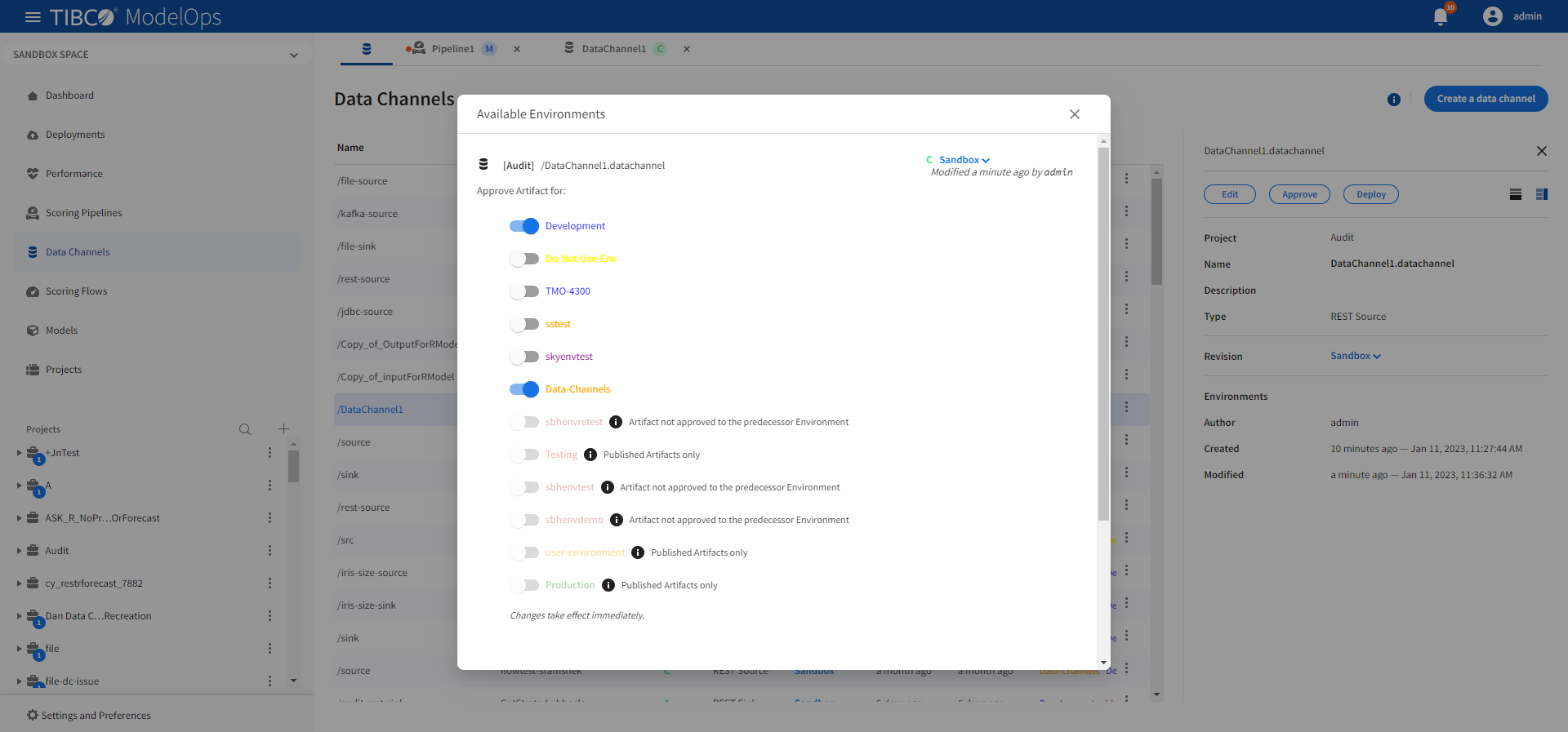 Note: Make sure to approve the data channels to an additional environment where scoring pipeline is deployed.