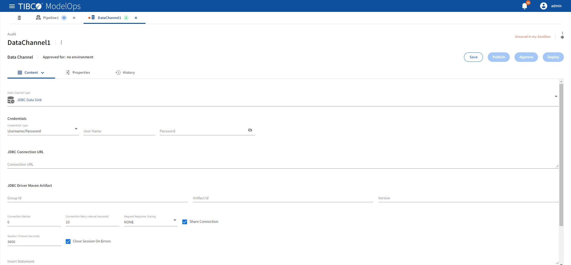 ModelOps JDBC data channels support selection or insertion of data records from or to a JDBC-compliant RDBMS (Relational Database Management System).