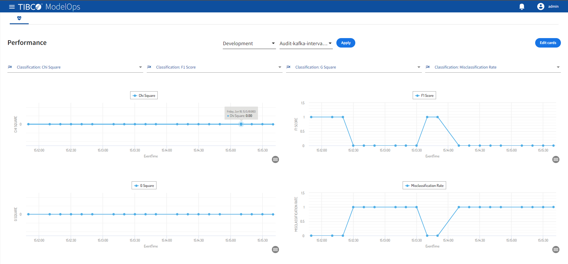 Before selecting the metrics, make sure you enter the proper environment and pipeline for deployment. Click Apply after you have entered the details. You can select 4 metric cards at a time to see the performance. Each card is represented using a line graph. At the bottom of each card, you can find a menu icon.