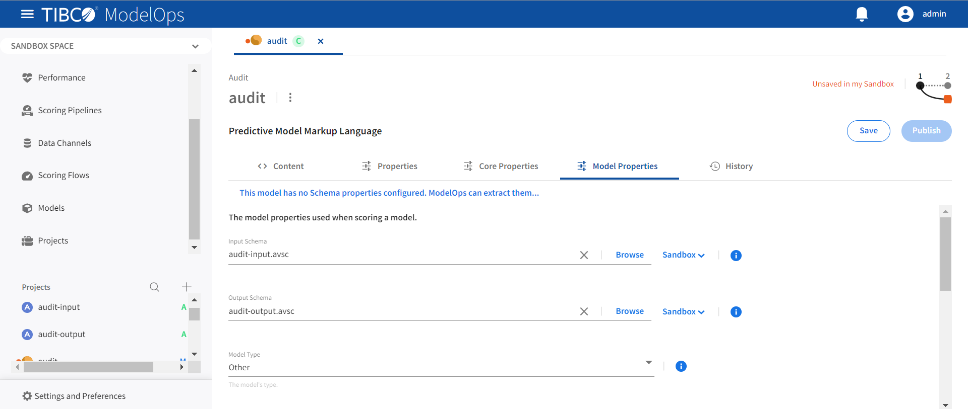 Next, click Model Properties and select the input and output schemas from the drop-down list.