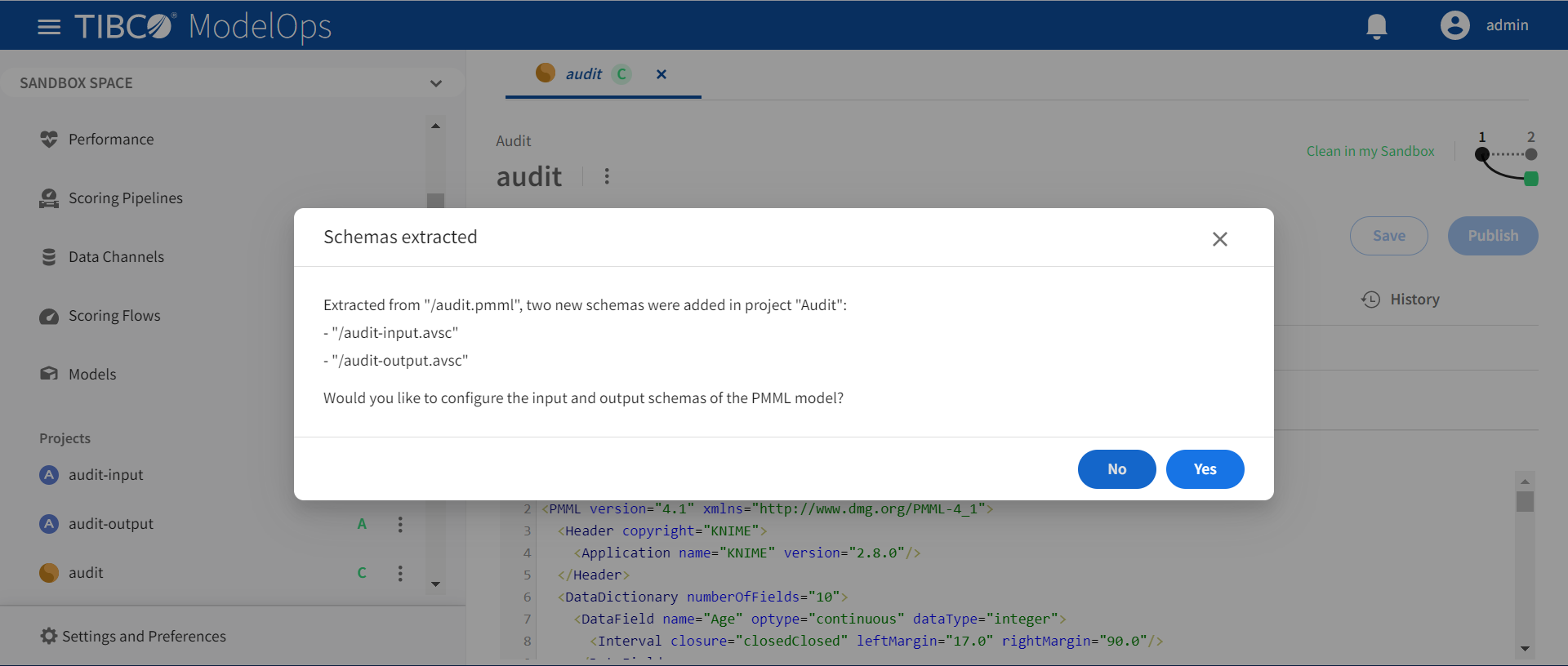 Select Model Schema > audit.pmml > audit-output.avsc schema.