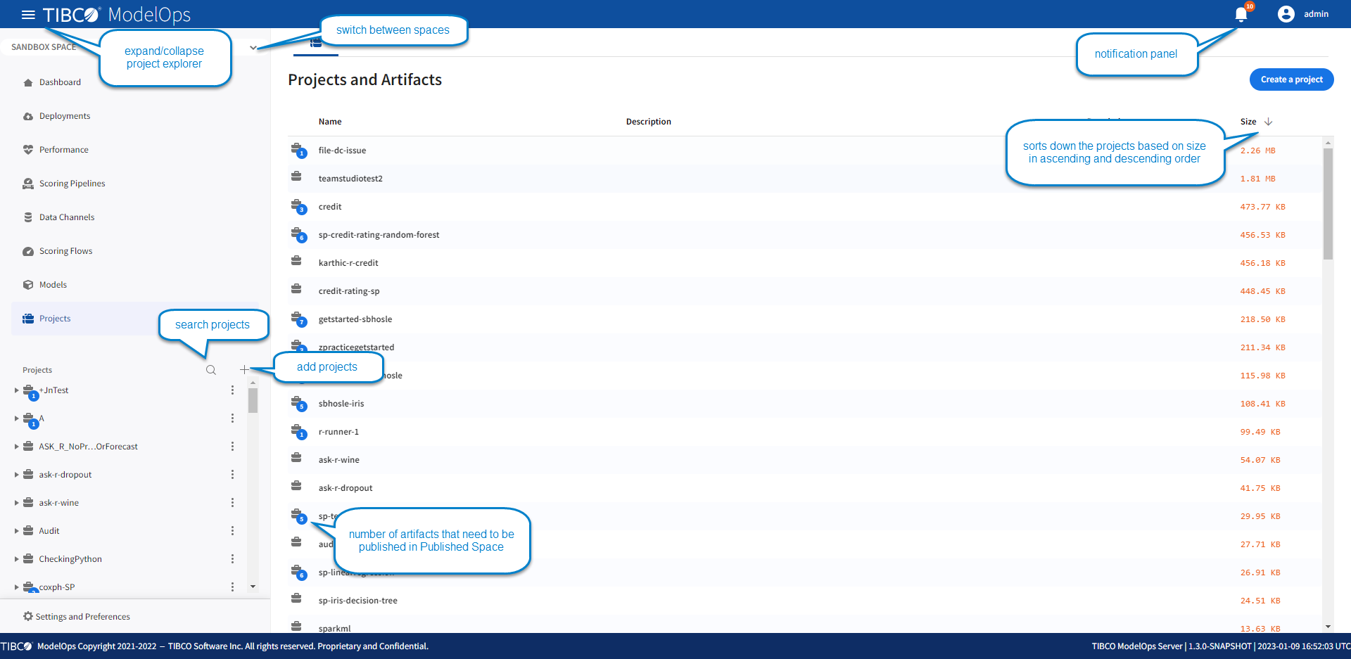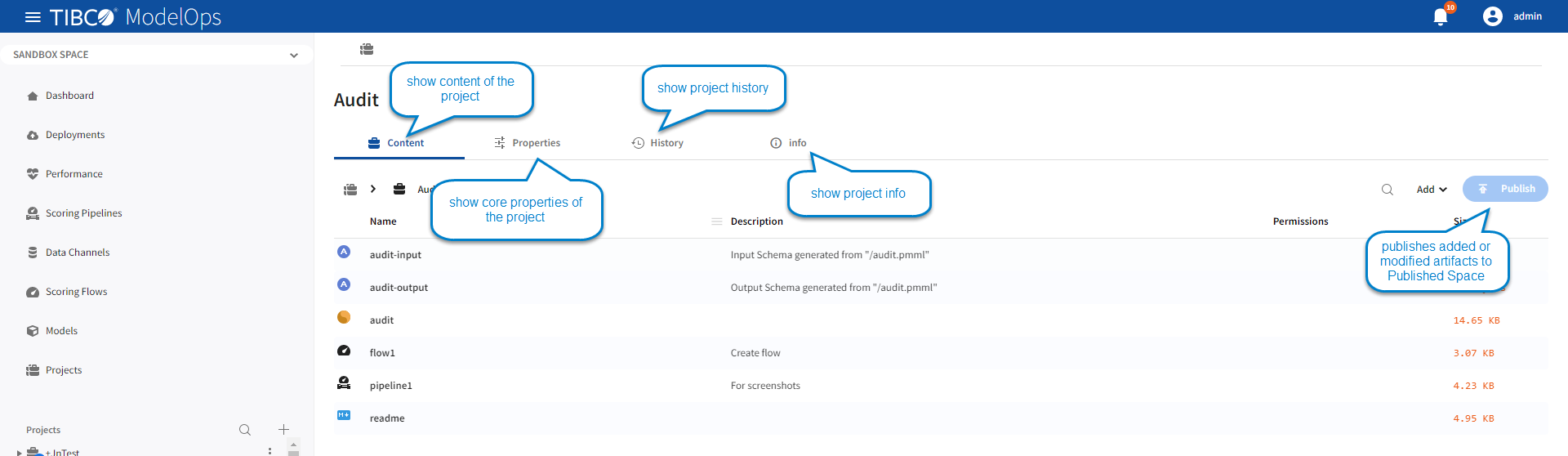 The ModelOps UI contains different views and menus for working with artifacts. Explore the following topics for more information: