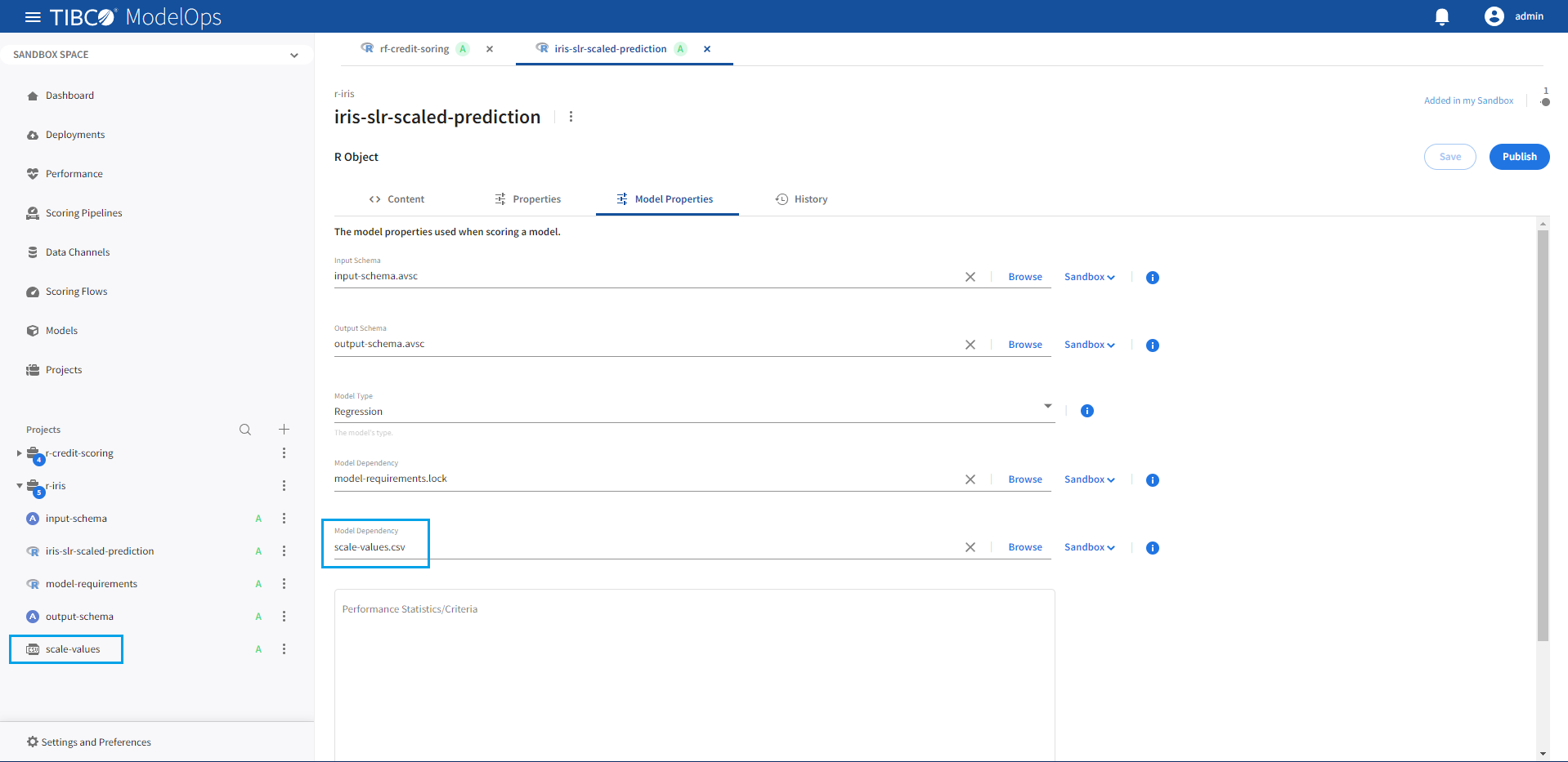For example, an R model might require values to scale the scored predictions from a CSV file. This file must be specified as a Model Dependency on the Model Properties page.