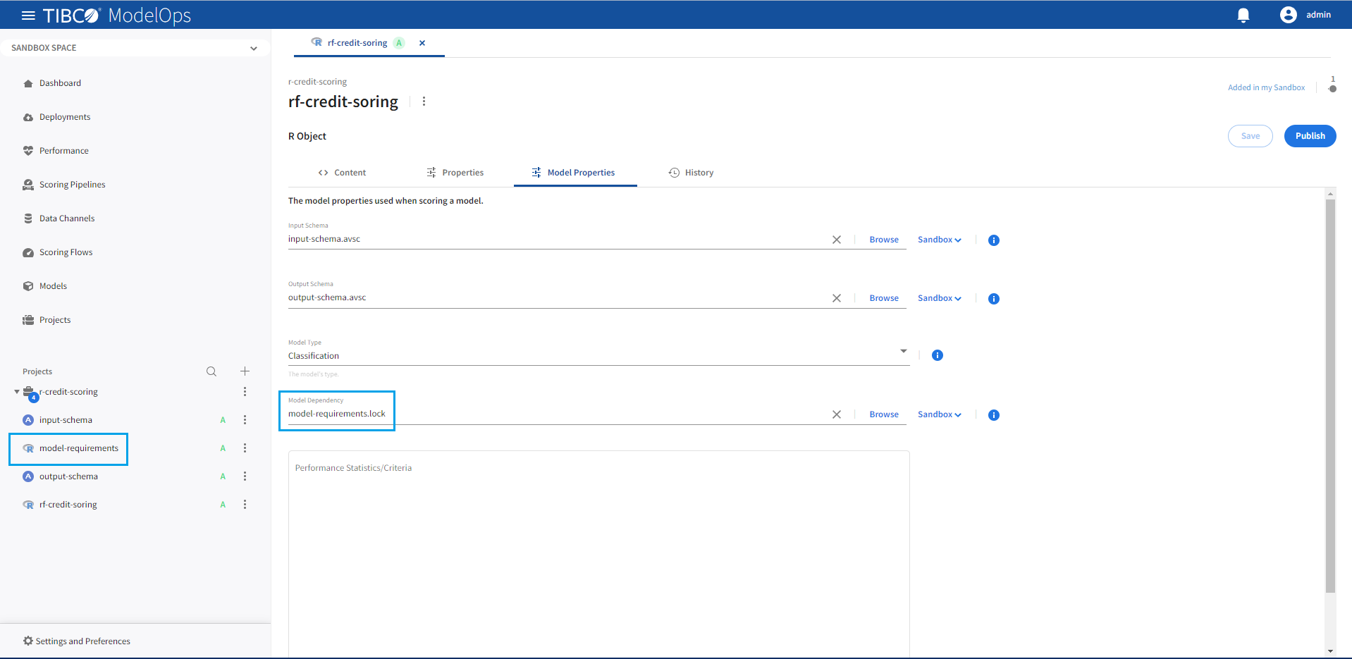R model package dependencies must be specified using an renv lockfile. The lockfile contents store the package dependencies of a specific R environment in the JSON format. Include an renv lockfile as an R model dependency on the ModelOps server Model Properties page.