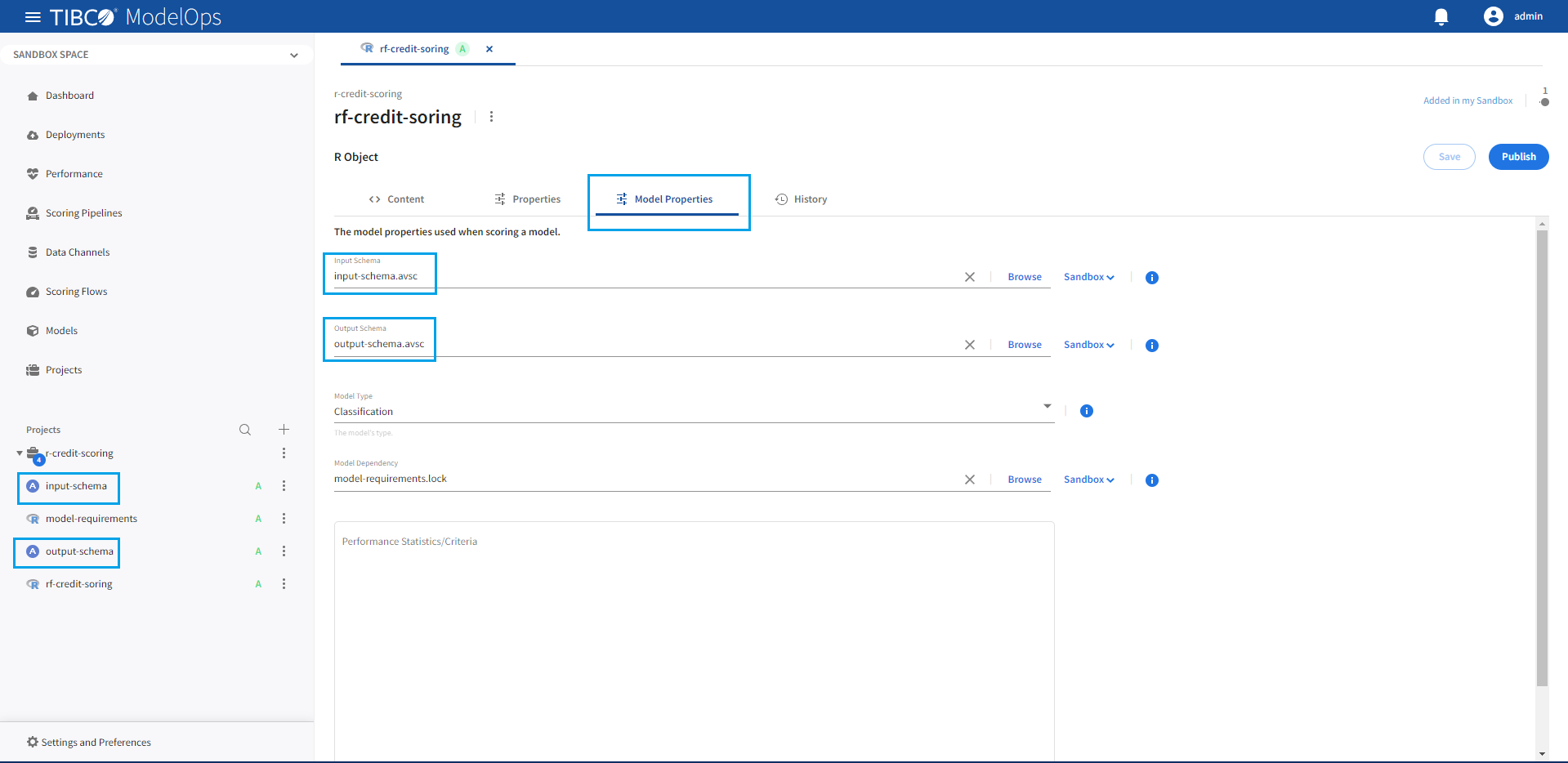 These R objects are called R models in TIBCO ModelOps. Input and output schemas must be bound to an R model before the model becomes available for use in the Score Data step.
