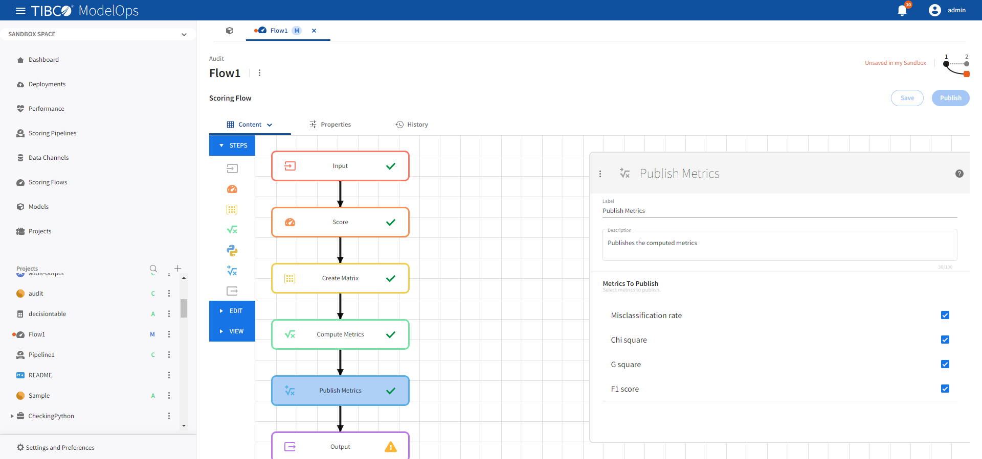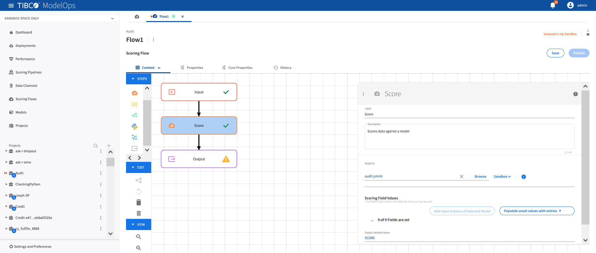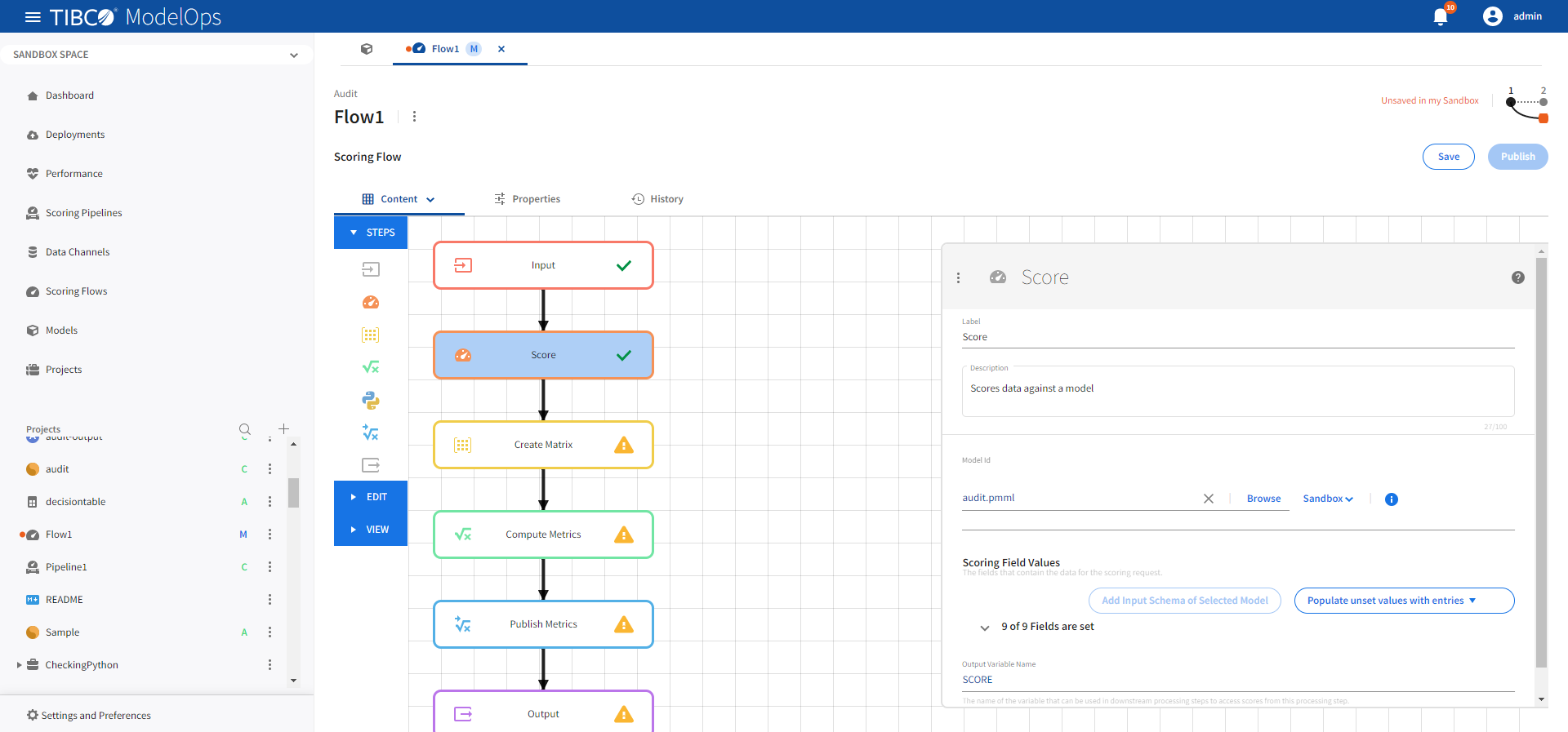 Once every block is configured and saved, you can publish the scoring flow to Published Space.