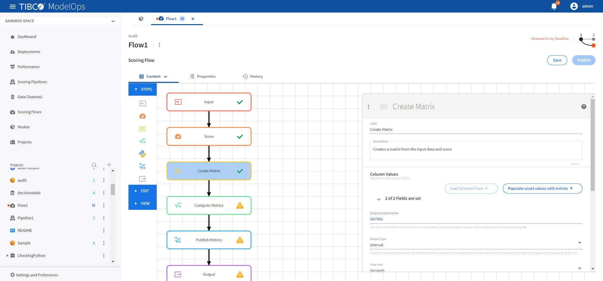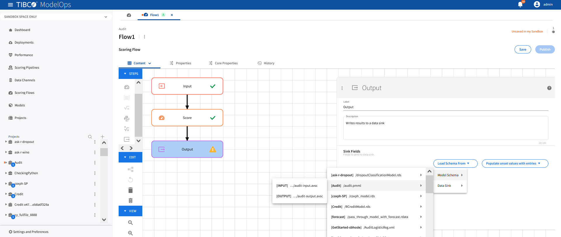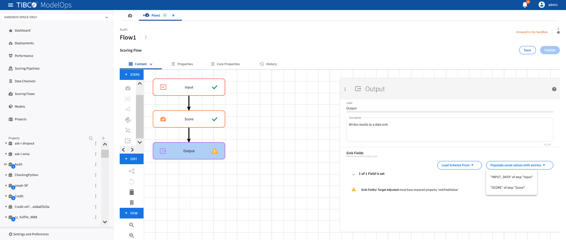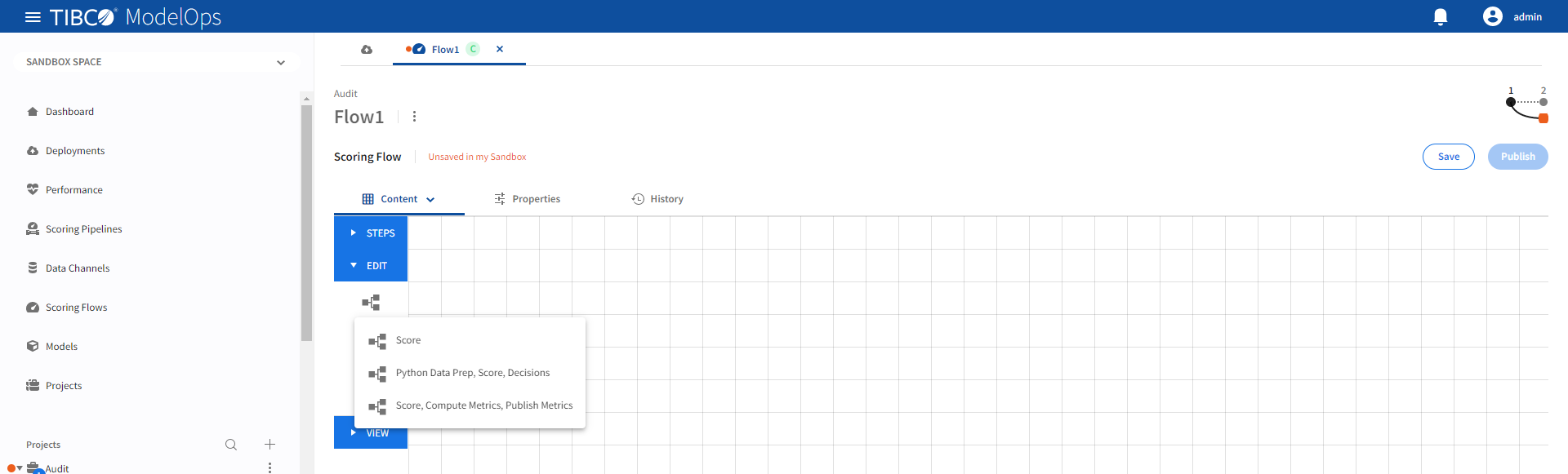 Once every block is configured and saved, you can publish the scoring flow to Published Space.