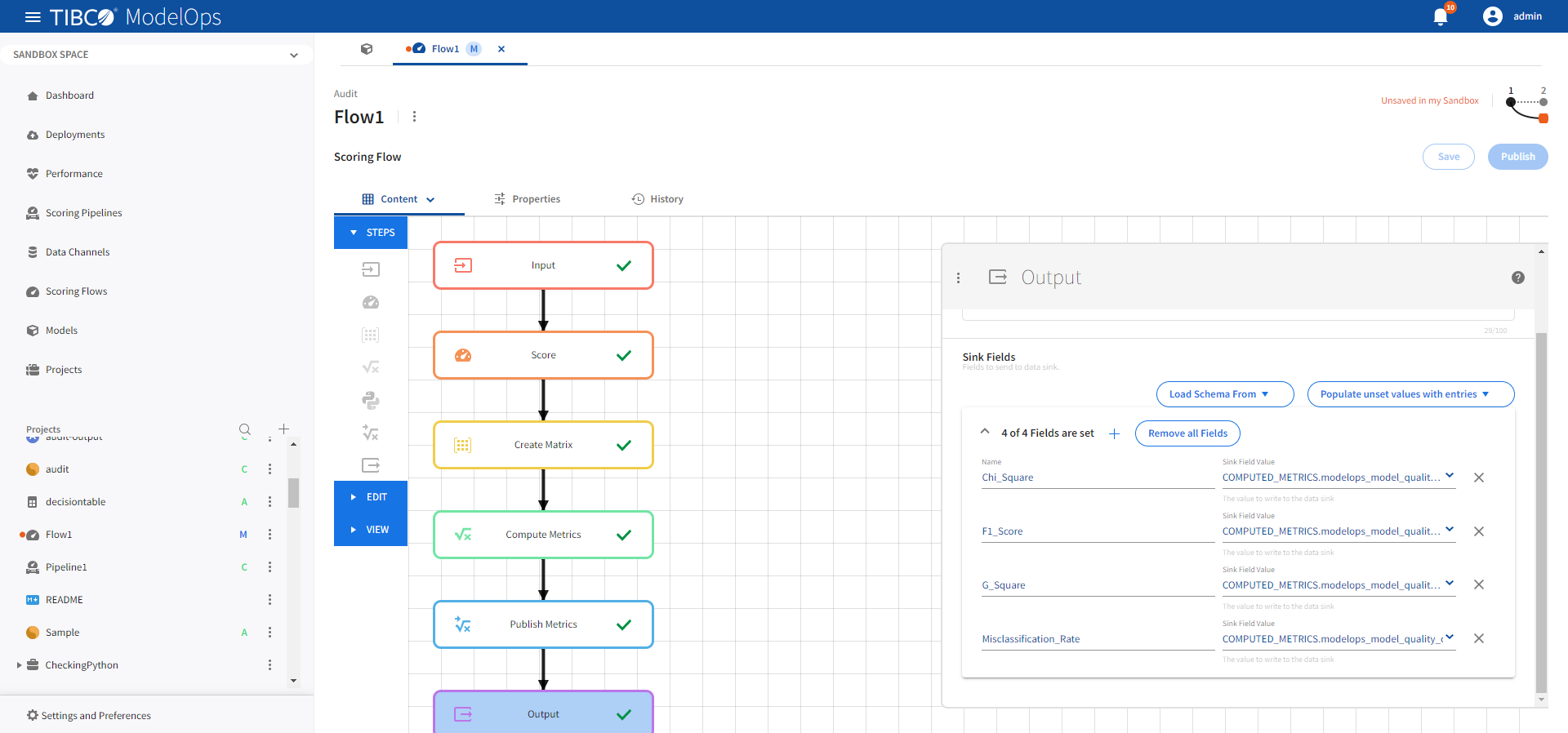 - Name: Chi_Square, Sink Field Value: COMPUTED_METRICS.modelops_model_quality_classification_chi_square