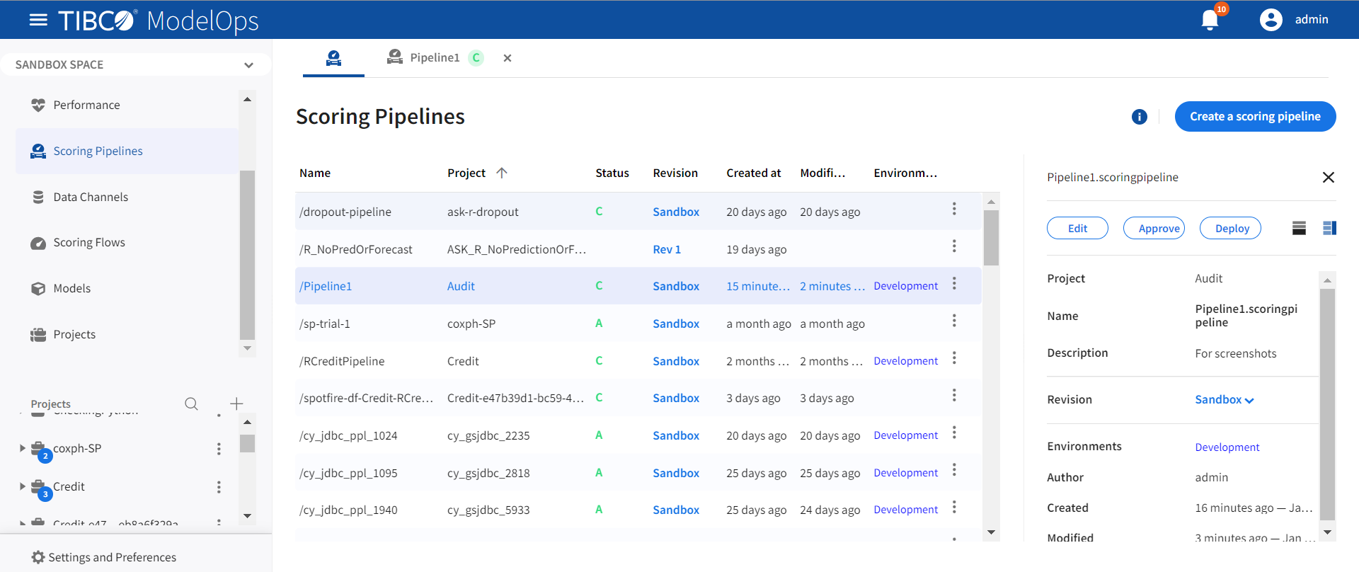 - Scoring Pipeline: A scoring pipeline is a design-time artifact that defines a scoring pipeline. A scoring pipeline defines a data source, a data sink, one or more scoring flows, and zero or more models used in the scoring flow.