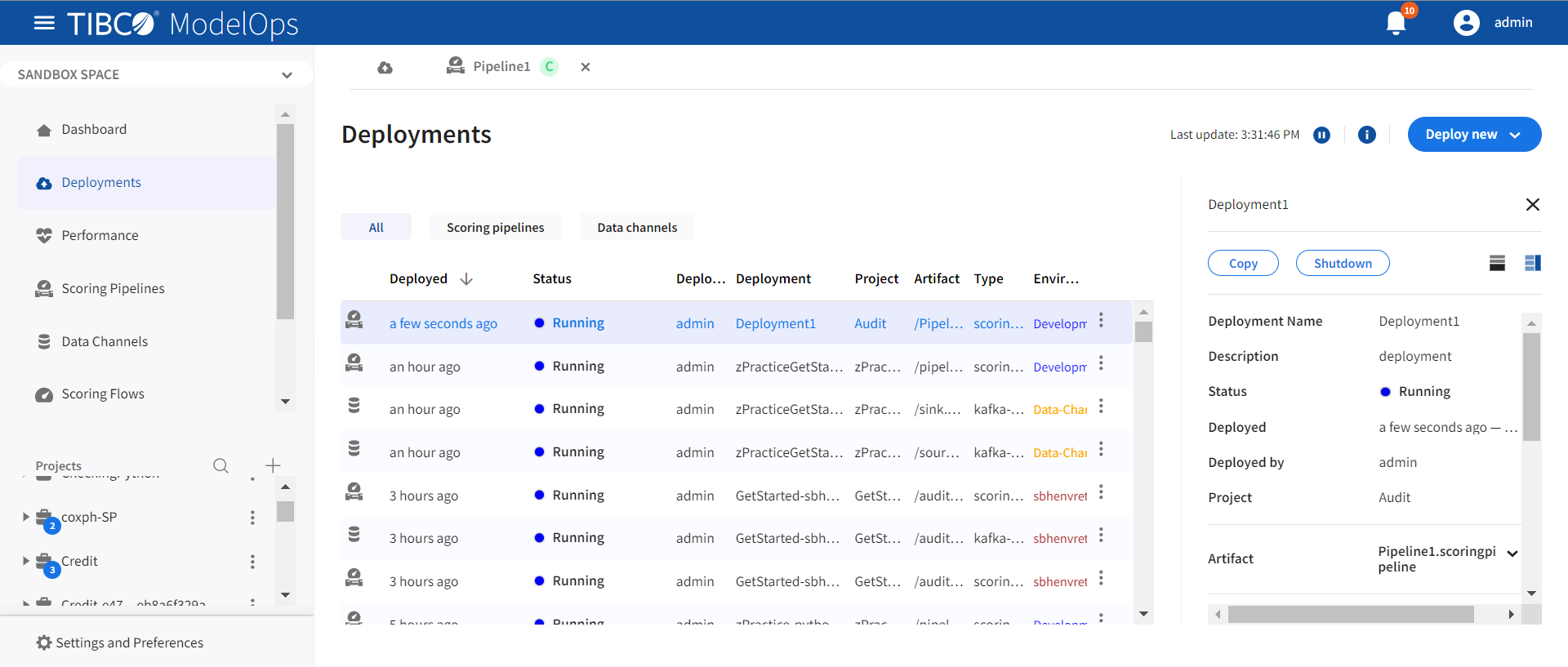 Click Deploy. You can see the deployed pipeline in the list on the main screen.