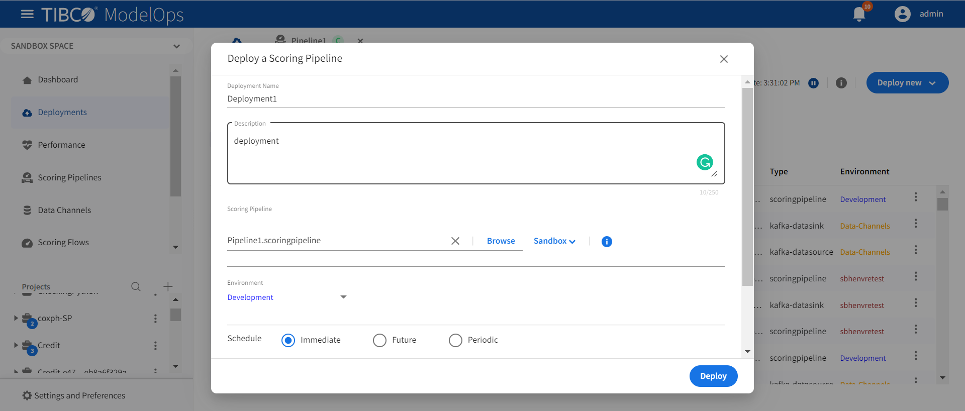 Click Deploy new and select Scoring Pipeline from the drop-down list.