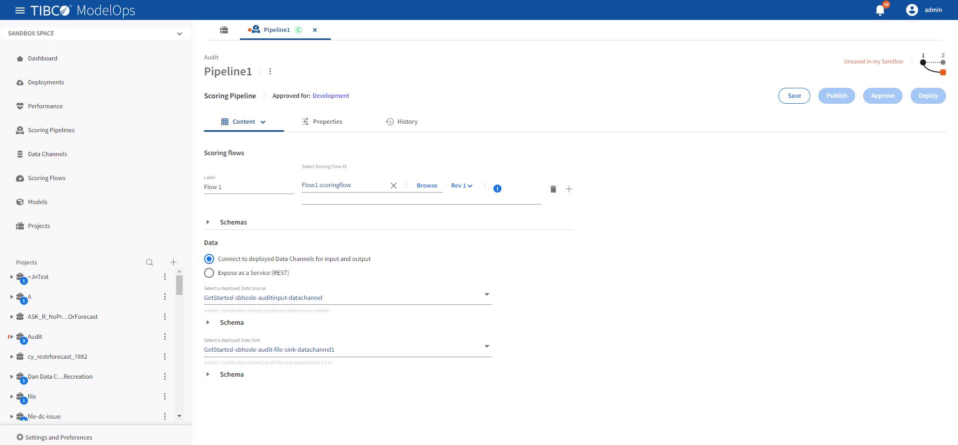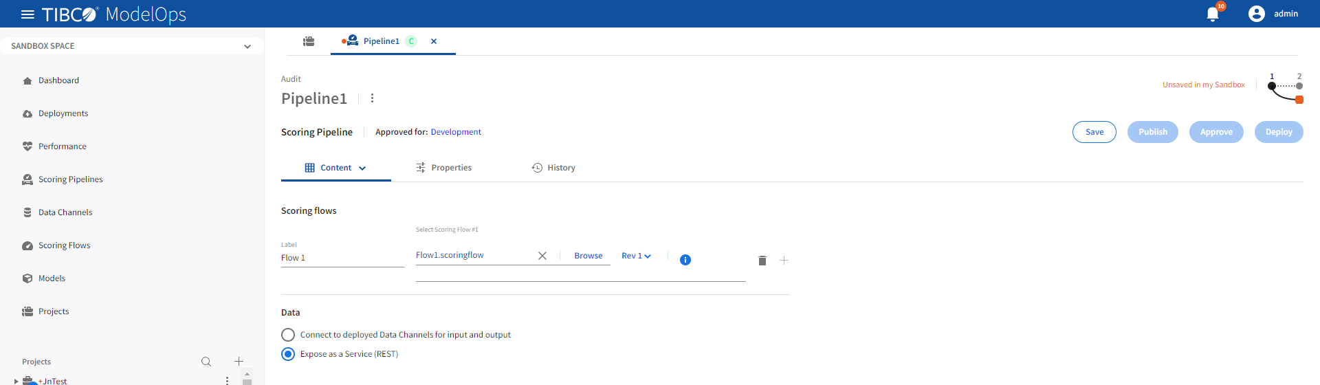 - Scoring pipelines can be defined to use data channels or be exposed directly as a REST service.