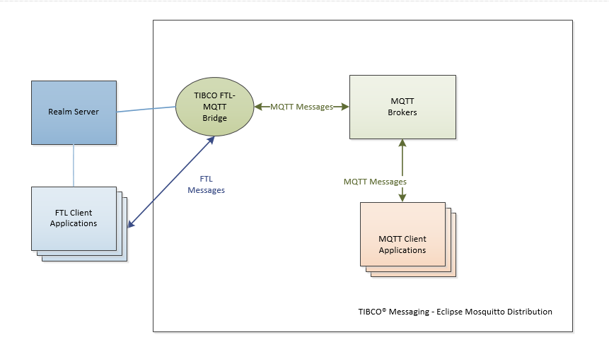 This diagram illustrates the interactions among the parts of TIBCO® Messaging - Eclipse Mosquitto Distribution.