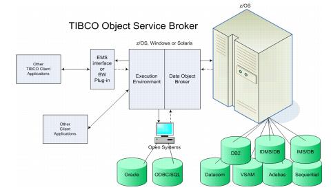 TIBCO Object Service Broker is a collection of components, Data Object Broker, Execution Environment, and client interfaces, based around a dynamic repository known as the MetaStor. It includes interfaces to mainframe and Open Systems application code and transaction environments.