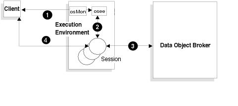 This chapter describes how to configure and start client sessions on Windows and Solaris. These sessions can run on the same machine as the Execution Environment and Data Object Broker or on machines and platforms separate from the Execution Environment and Data Object Broker.The osMon process, which an administrator would have started earlier, starts an osee. During initialization, the Execution Environment obtains Execution Environment and session default information.The session obtains the Data Object Broker name, session defaults, and interfaces for the Execution Environment binding areas. It merges client and session defaults, and opens the session log.