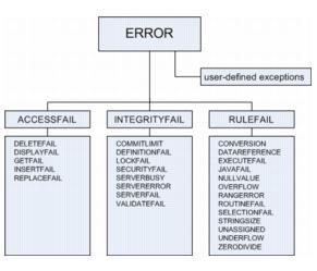 Format Code COMMIT ;display screen [& TRANSFERCALL[WHERE [¬] field / parm_name relational_operator / LIKE expression { & / | [¬] field relational_operator / LIKE expression}][ASCENDING/DESCENDING] field {& ORDERED[ASCENDING/DESCENDING] field}]{statement;}[WHERE [¬] field / parm_name relational_operator / LIKE expression {& / | [¬] field relational_operator / LIKE expression}][ASCENDING/DESCENDING] field {& ORDERED[ASCENDING/DESCENDING] field}](expression);ROLLBACK ;SIGNAL exception_name;[TO queue]{statement;}{statement;}The following diagram illustrates all system exception names in their relative position in the exception hierarchy. Each identification represents a lower level in the hierarchy.A handler for an exception traps the exceptions that are listed beneath it (i.e., lower in the hierarchy). For example, the ERROR exception traps all detectable errors and the INTEGRITYFAIL exception traps only the exceptions listed from COMMITLIMIT to VALIDATEFAIL.The conditions that trigger each of these exceptions are described below in alphabetical order. For more information, refer to TIBCO Object Service Broker Programming in Rules.A table access error is detected or a rule running in browse mode is attempting to update a table.The limit on the number of updates between synchronization points has been reached.A value has invalid syntax or cannot be converted to the target syntax.The primary key for a DELETE statement does not exist or a rule running in browse mode is attempting to update a table.The primary key provided for an INSERT statement already exists or a rule running in browse mode is attempting to update a table.Another transaction is accessing this data in a way that prevents you from accessing the data.An arithmetic operator is being applied to a numeric null or a numeric null is being passed as an argument value when a numeric value is required.A value is too large to be assigned to the target syntax. The maximum value for the syntax is inserted into the receiving field. All tables are limited to the defined dictionary length. As well, screen and report tables are also limited to the display length.An argument to a given OSB routine is out of the allowable range.A primary key provided for a REPLACE statement does not exist or a rule running in browse mode is attempting to update a table.A call to an OSB routine cannot complete successfully and a more specific system exception cannot be signaled.An error results from incorrect rules coding, given that the dictionary definition of the database is correct.An error is detected in a table occurrence during the evaluation of selection criteria.The requested external database server is not available to process the transaction.The requested external database server is not available to process the transaction.The connection to an external database server broke during a transaction or the external database server failed.The receiving string field is too short to contain the full length of the string value being assigned to it. The value is truncated to the length of the receiving field and inserted into that field.Reference is being made to a field of a table not assigned a value.A value is too small to be represented in the target syntax (usually exponent errors). The minimum value for the syntax is inserted into the receiving field.An attempt is being made to update a screen or table with invalid data. For example:
