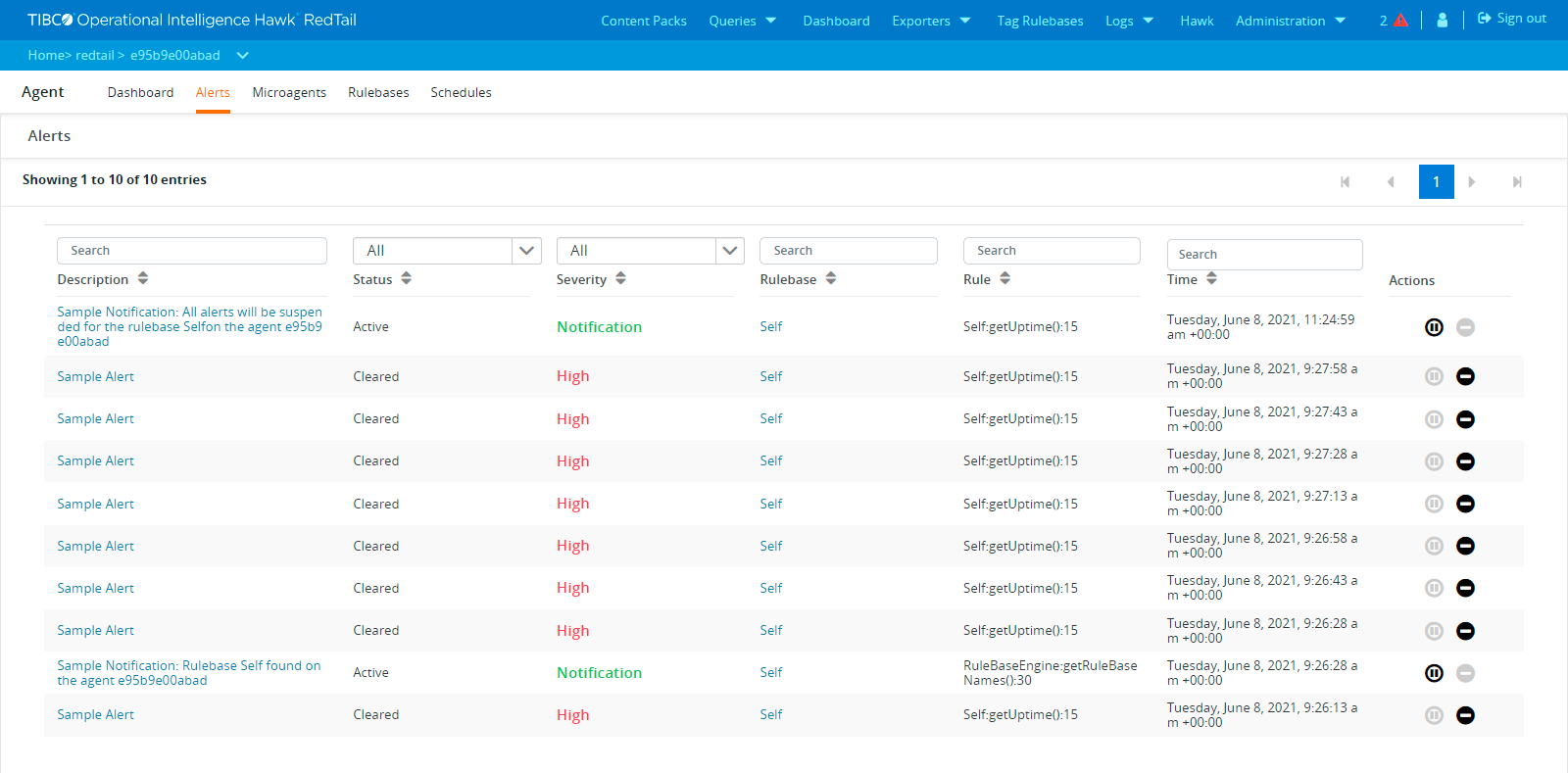 The Alerts tab lists all the alerts for the Hawk agent in a table. You can sort and filter these alerts by using these columns.