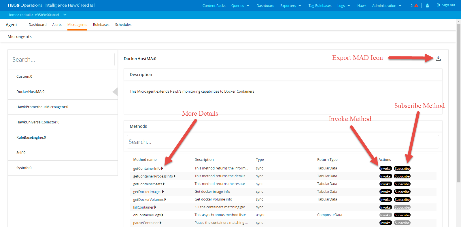Method Name - To see more technical specifications of the method, click the method name. It displays more details about the method, such as arguments and returns. For details about microagent and methods, see TIBCO Operational Intelligence Hawk® RedTail - Container Edition Microagent Reference Guide. |