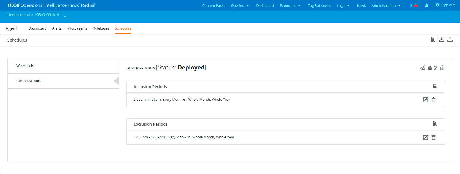 Deploy schedule - Click the Deploy Schedule icon ( ) to deploy the schedule to the Hawk agent. After deployment, the schedule can be applied to the rulebases and rules for the Hawk agent. For details, see Deploying a Schedule to an Associated Hawk Agent. |