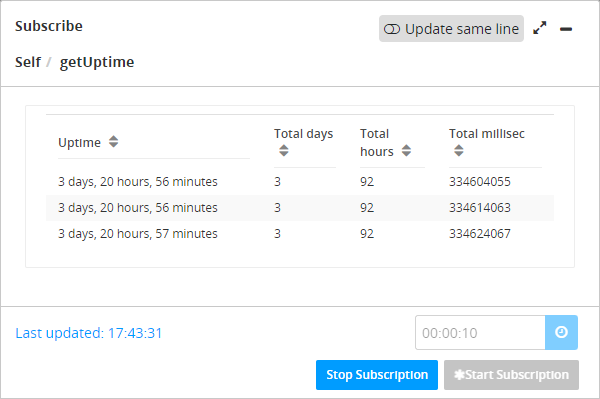 The result of the method is displayed in the window with a new line added after each subscription interval. If required, you can also select the Update same line option to display every result after updating the same line.