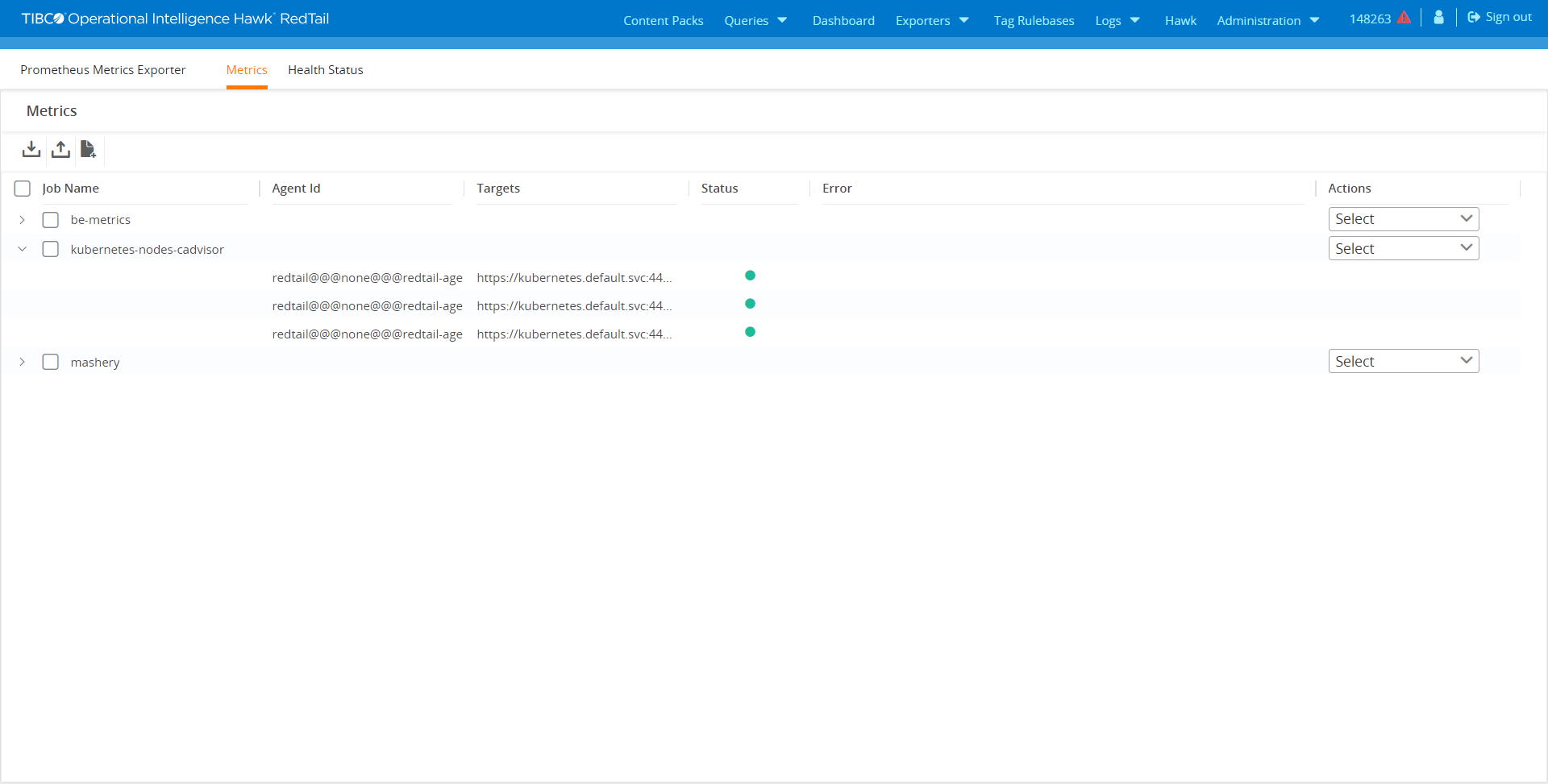 Action - You can perform actions on the Prometheus Metrics Exporter job such as Edit, Export, Duplicate, or Delete. |