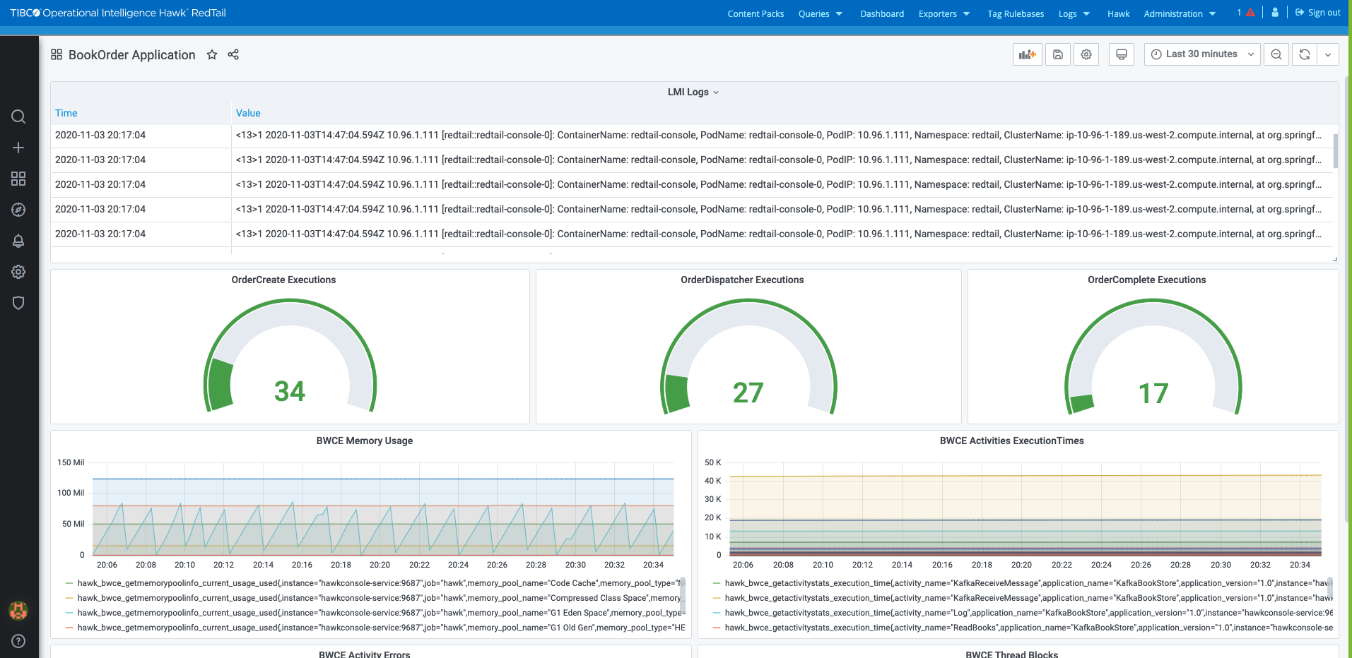 You can now customize dashboards in TIBCO OI Hawk RedTail - Container Edition. You can create and maintain multiple dashboards at once. You also have the ability to customize the panels within the dashboards in which multiple queries can be configured. Each panel use the visualizations such as line charts, tables, and gauges. The following image shows a dashboard which comprises different panels and visualizations. For more information, see Grafana Documentation.