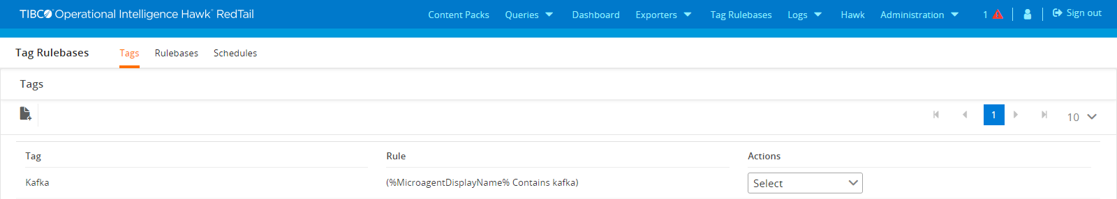Click Tag Rulebases in TIBCO OI Hawk RedTail - Container Edition UI to open the Tag Rulebases page. The following actions are available on the Tag Rulebases tab: