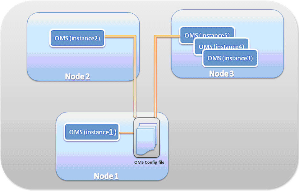 The multi-node multi-instance, or horizontal scaling deployment topology, can be achieved by running multiple instances of microservices on multiple nodes (machines). This is mainly done to increase the overall processing capacity of the TIBCO Order Management - Long Running server-side components namely omsServer and jeoms. The default microservice instance is duplicated on the main and other nodes to run multiple instances.
