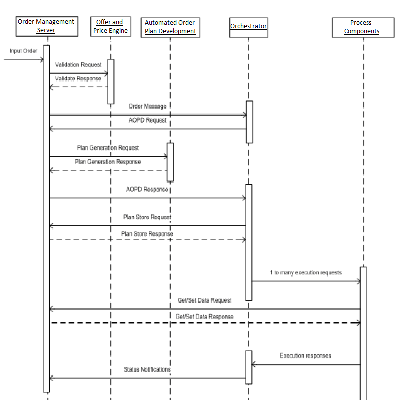 An incoming order to TIBCO Order Management - Long Running consists of one to many order lines, with each line requesting a product or service to be fulfilled. Orchestrator sends the order received from the Order Management Server component to Automated Order Plan Development for the execution plan generation. Automated Order Plan Development component has the active reference of the product and the customer catalog.