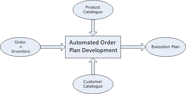 Automated Order Plan Development generates the execution plan by applying rules on the incoming order against the product, customer catalogs and the optional inventory for the customer coming along with the order in execution plan generation request. See figure Plan Generation by Automated Order Plan Development Inputs and Outputs