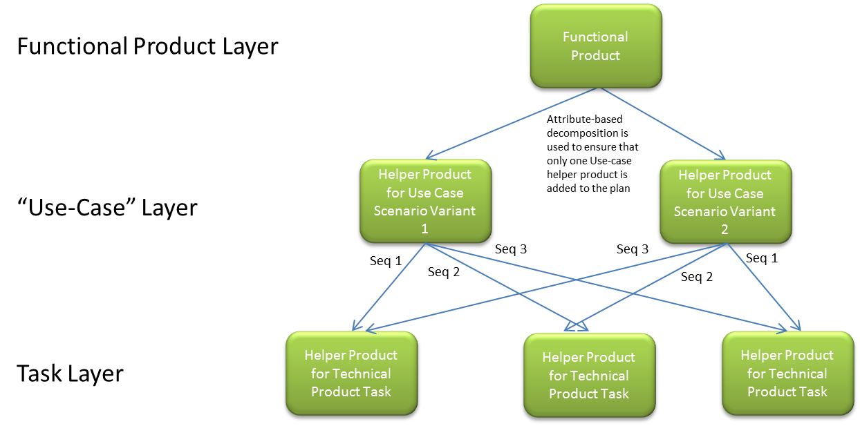 The solution is to use a new layer of helper products in the hierarchy, representing the use case scenario. For a given order, attribute-based decomposition is used to ensure that only one use case helper product is included in the execution plan, making them mutually exclusive.