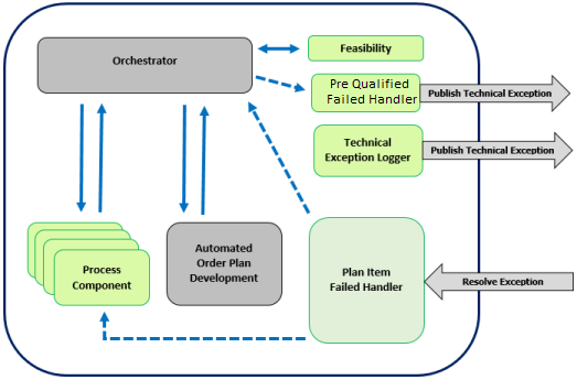 It must be noted however that any component within the TIBCO Order Management - Long Running can generate a technical exception. This includes those shown below, and the core components, such as Orchestrator, data access interfaces, and Automated Order Plan Development.