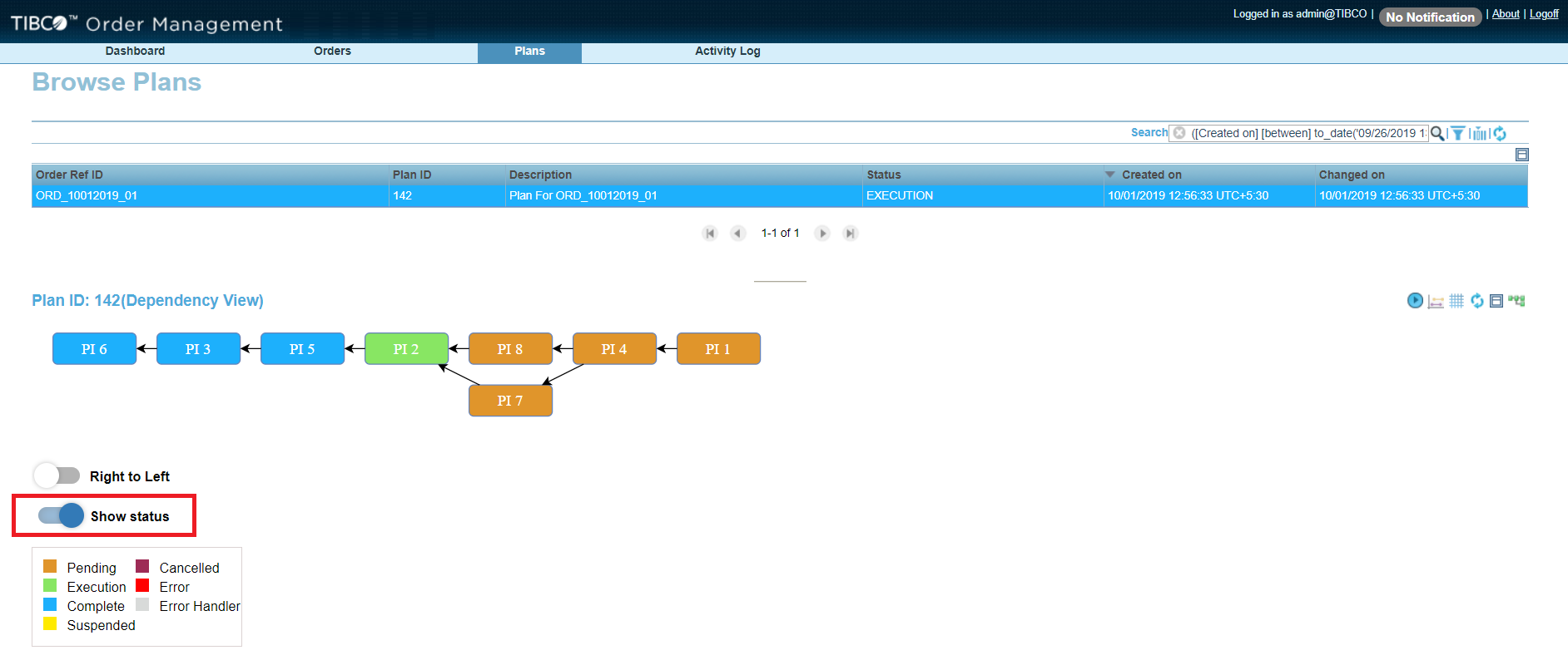 Show status switch is enabled, a legend shows the status associated with each plan items. You can identify the plan items by their plan item id written in the boxes representing the plan items.