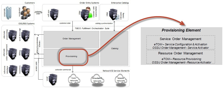 - TIBCO® Fulfillment Provisioning: TIBCO Fulfillment Provisioning is a provisioning component that automates the activation of the underlying network services and allocation of all the network resources. This provisioning element implements service order management and resource order management TAM applications, aligns to service and resource activator OSS/J order management components, uses eTOM service configuration and activation, and implements resource provisioning processes and functions.