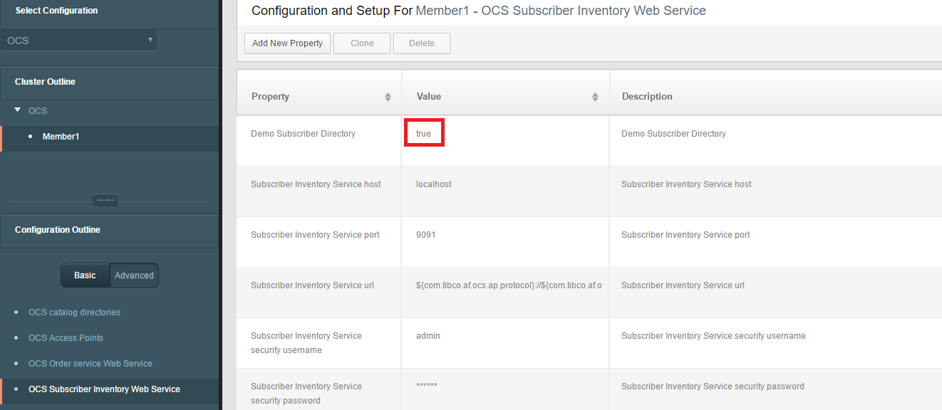 From the Order Capture System Subscriber Inventory Web Service Configuration Outline in TIBCO Master Data Management Configurator, the first line of configuration values for Demo Subscriber must be switched to true to enable and false to disable. If Demo Subscriber Directory is disabled, Order Capture System accesses the Subscriber Inventory Web Service configured in Order Capture System Subscriber Inventory Web Service Configuration Outline.