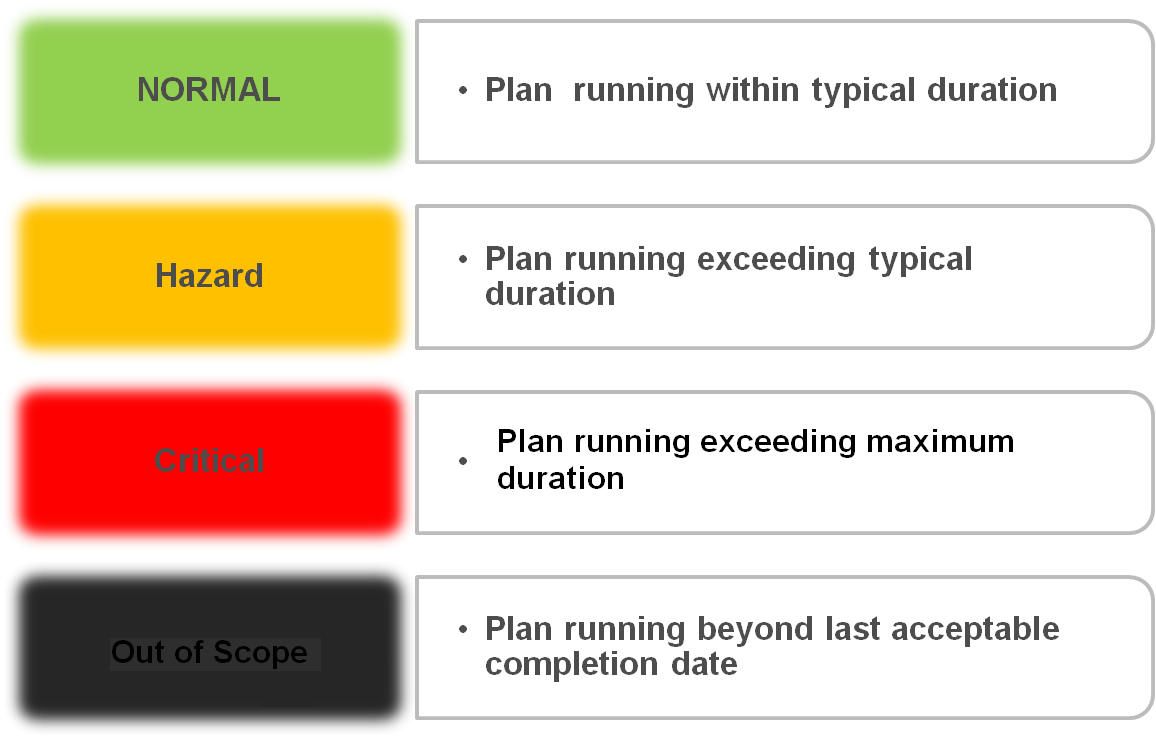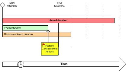 There are critical paths identified in execution plans, constructed using the typical and maximum durations of the plan tasks included in those plans. If one of the process component sections being monitored has not completed before its defined typical duration, a monitor event is triggered (consequential action is performed). If the section has not completed before the end of its maximum allowed duration, another monitor event is triggered. For Example, a plan has taken longer than expected/predicted. The plan task has exceeded its typical duration, its maximum duration, and two subsequent monitoring intervals. A monitor event has been fired at each stage to notify you of the following: