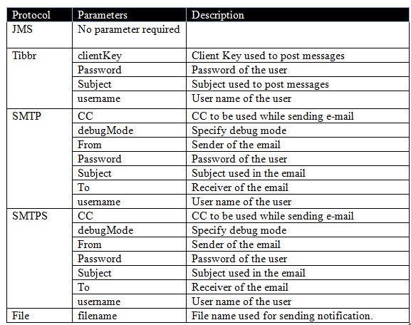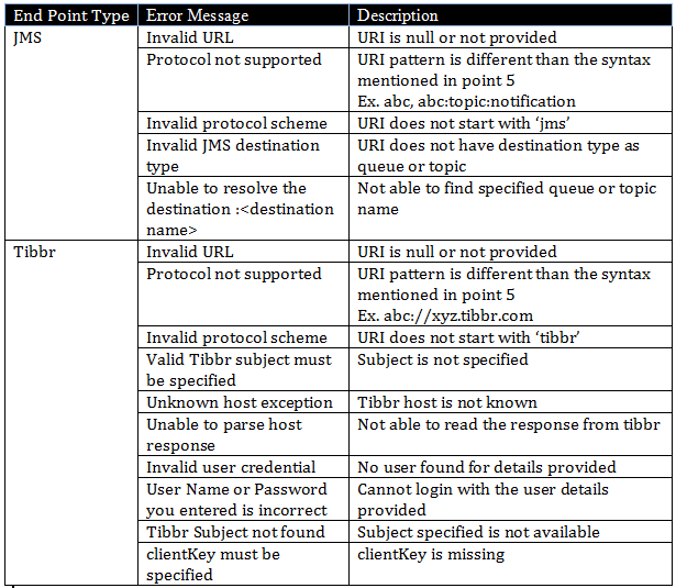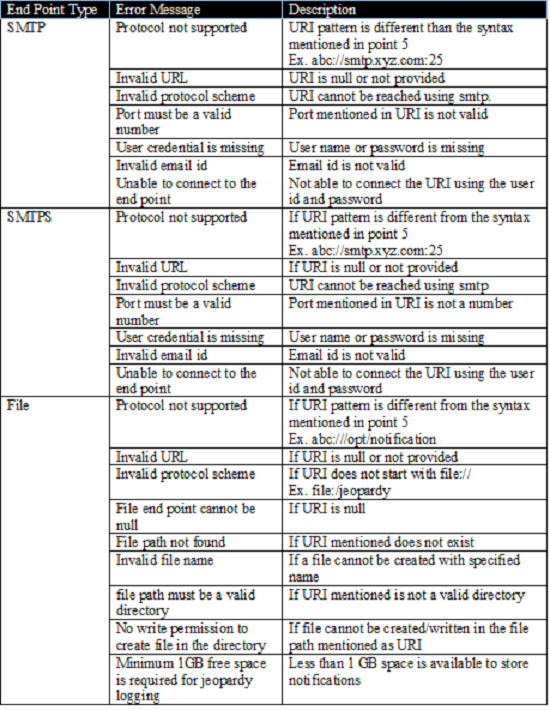 End Point Type URI Syntax Example JMS Queue jms:queue:<queue name> jms:queue:jeopardy.notification JMS Topic jms:topic:<topic name> jms:topic:jeopardy.notification Tibbr tibbr://<hostname:port> tibbr://xyz.tibbr.com SMTP smtp://<hostname:port> smtp://smtp.xyz.com:25 SMTPS smtps://<hostname:port> smtps://smtp.xyz.com:465 File file://<filepath> file:///opt/notification - Select message type for the notification. The following table shows protocol and supported out message type