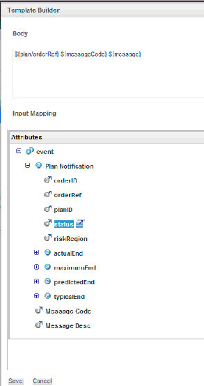 - The following is the Template Builder window, which has all the notifications parameters listed to configure a template for notification messages.