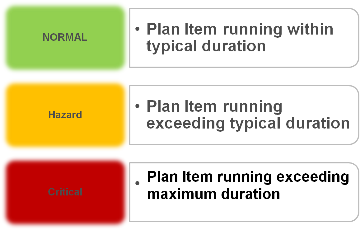 - Managing Critical Paths: Jeopardy management computes and keeps an account of critical paths through an execution plan. Two of these critical paths correspond to the typical and maximum durations of process components. The third type of critical path is based on the actual duration to date, once the execution plan has started processing. The critical paths are used to predict the completion date and time of the execution plan. By viewing the critical paths in the UI GANTT Chart, you can determine whether your execution plan is progressing normally or if it is in danger of being in jeopardy. The Order Management Server UI highlights each plan item as per the following legend scheme: