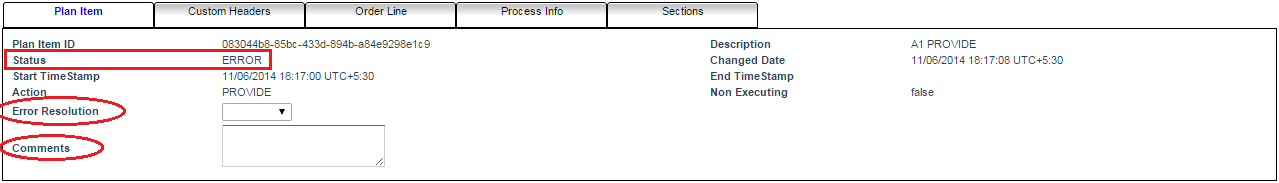 After clicking the plan item you get the details for the plan item. This plan item have Status as ERROR and have option so that you can choose the appropriate Error Resolution and Comments for the specific plan item.