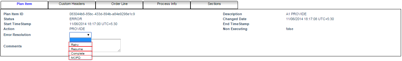 Error Resolution is a drop-down box that contains actions that you have to perform to fix the plan item in ERROR state. You have following choices for the plan item’s Error Resolution: