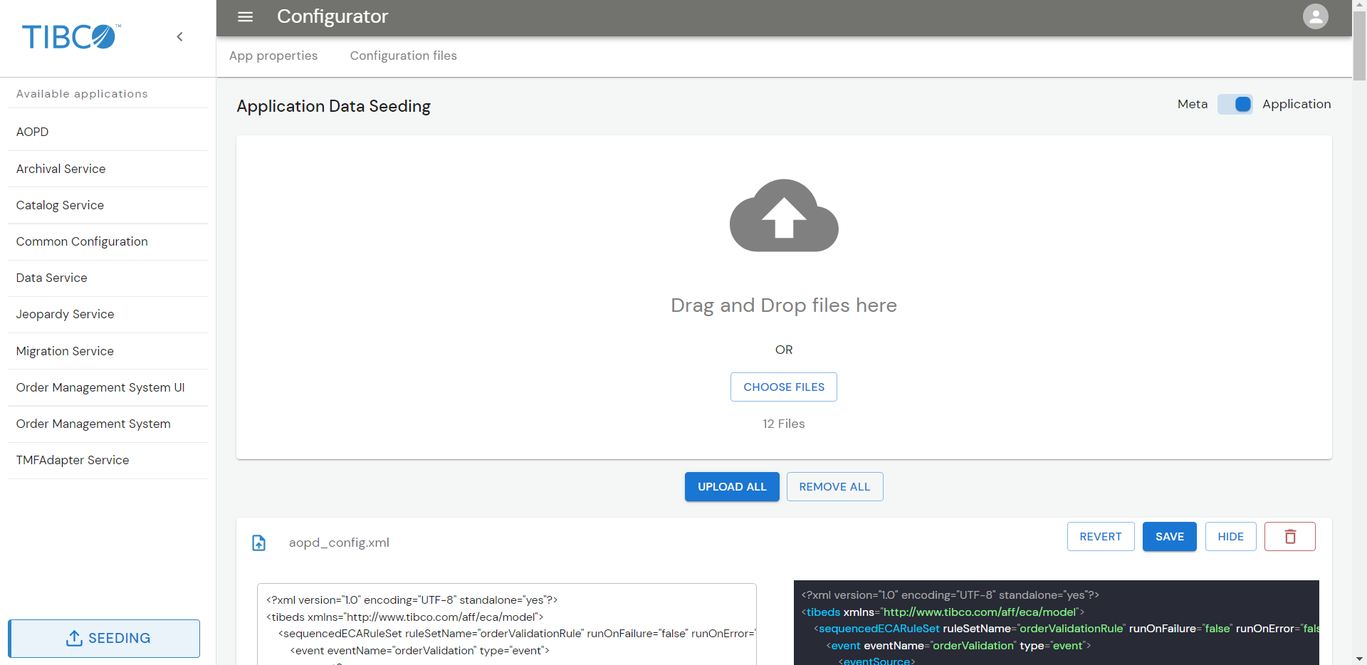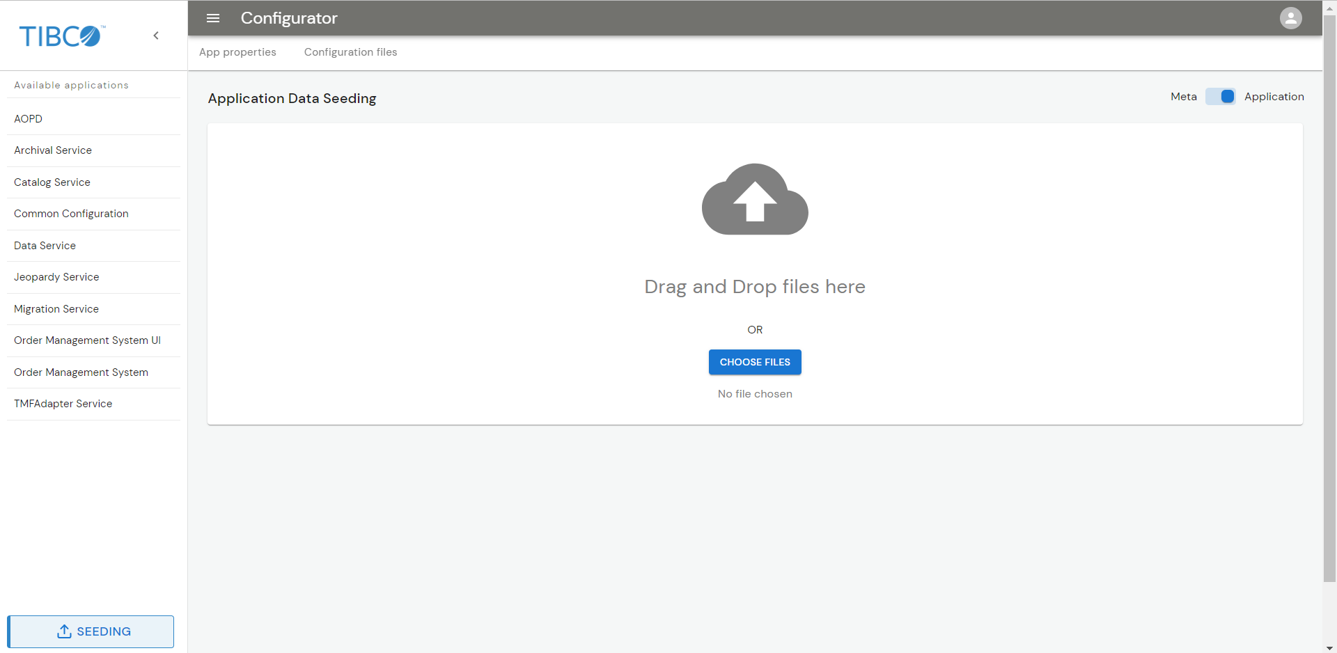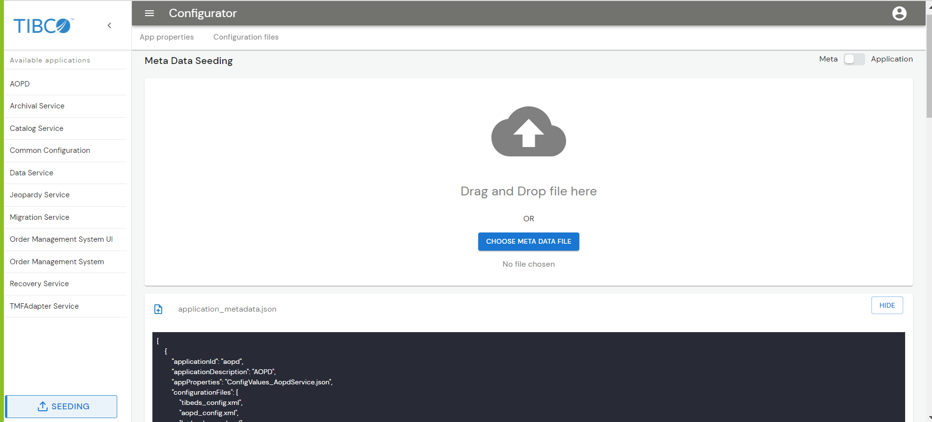 Once you start the Configurator UI, you can upload the metadata file, application properties, and configuration files through the UI. These files are present in the $OM_HOME/seed-data directory.