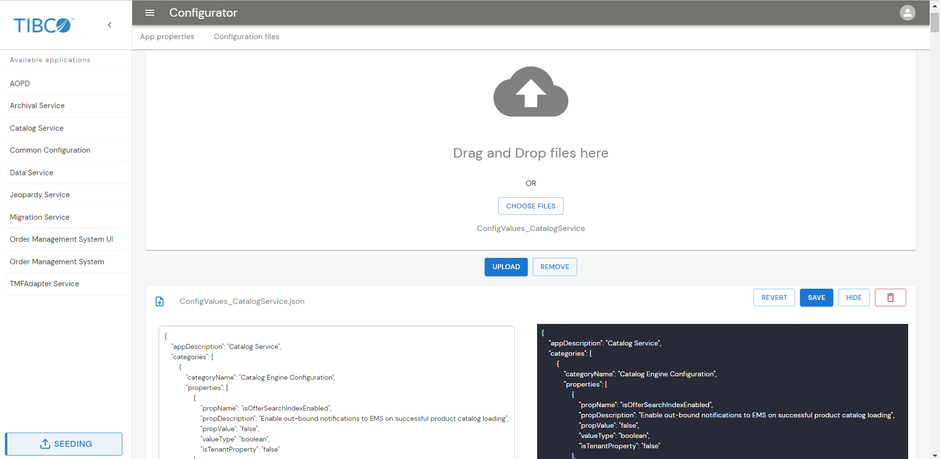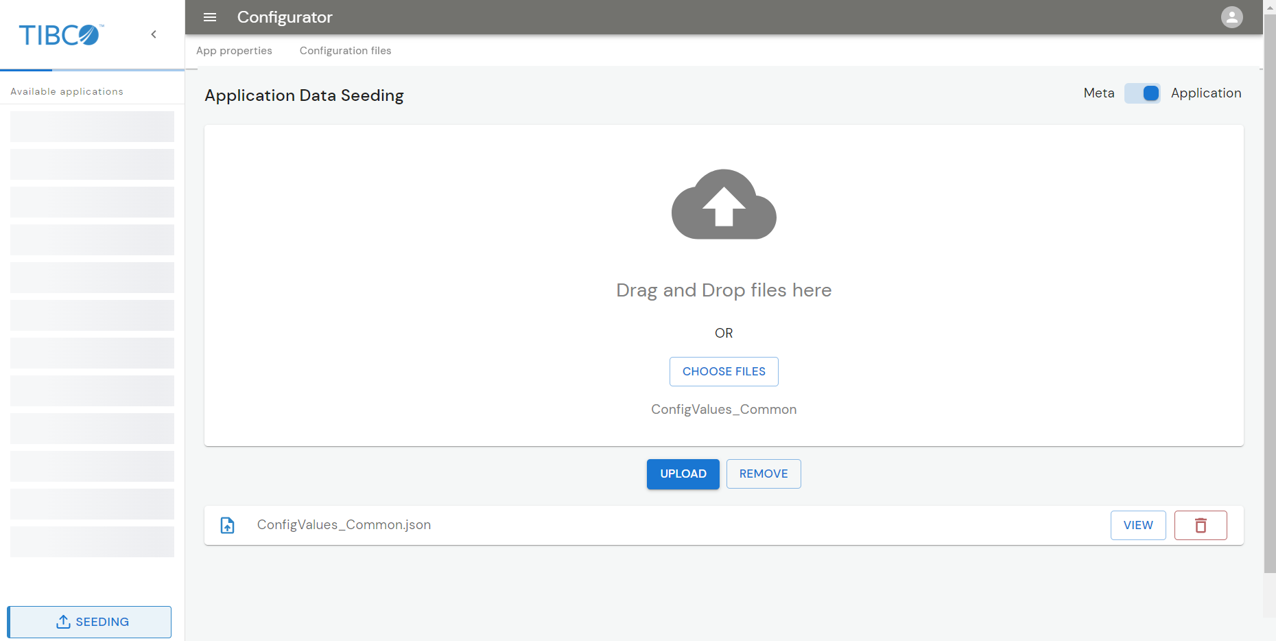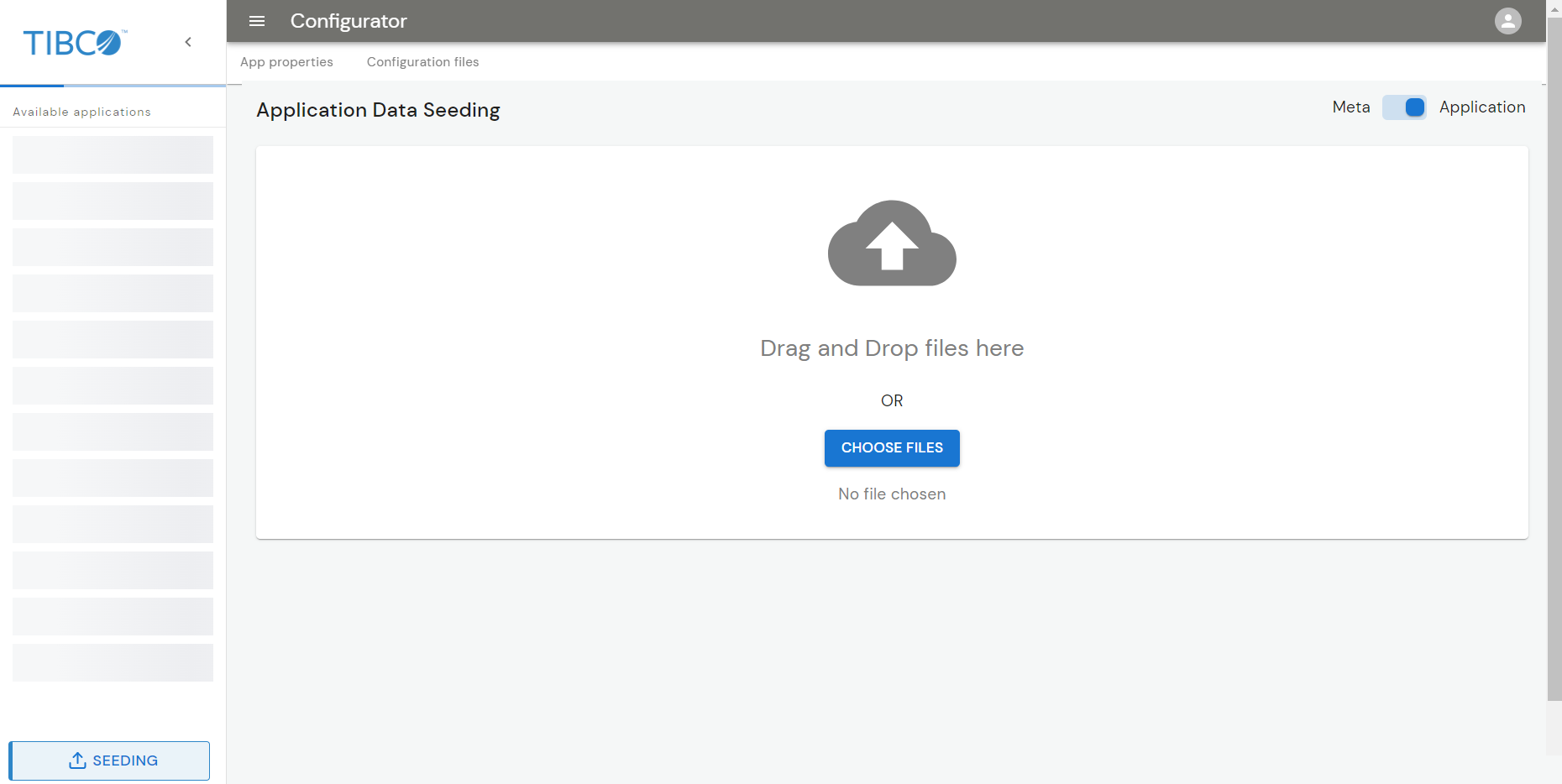 Once you start the Configurator UI, you can upload the metadata file, application properties, and configuration files through the UI. These files are present in the $OM_HOME/seed-data directory.
